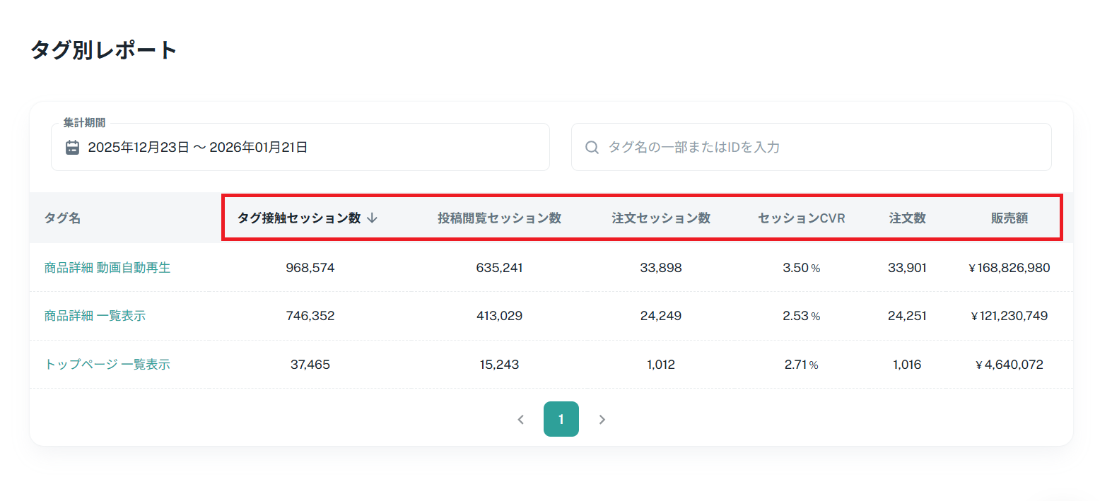 注文セッション数:タグに接触してから注文に至ったセッション数(タグ内のコンテンツに含まれない商品の注文を含む)