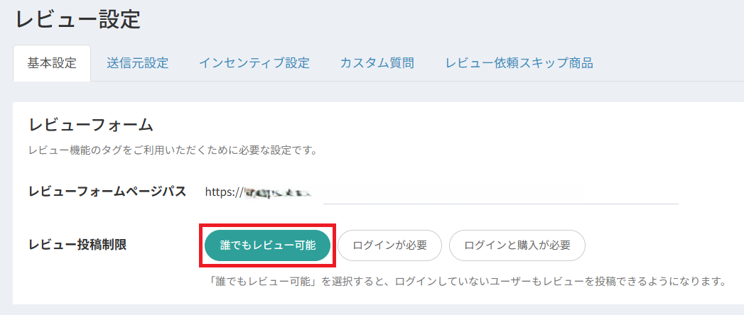そこで検討したいのが、レビューフォームの投稿制限を「誰でもレビュー可能」に設定することです。この設定を選ぶと、ログインしていないユーザーでもレビューを投稿できるようになり、より多くのレビューが集まりやすくなります。