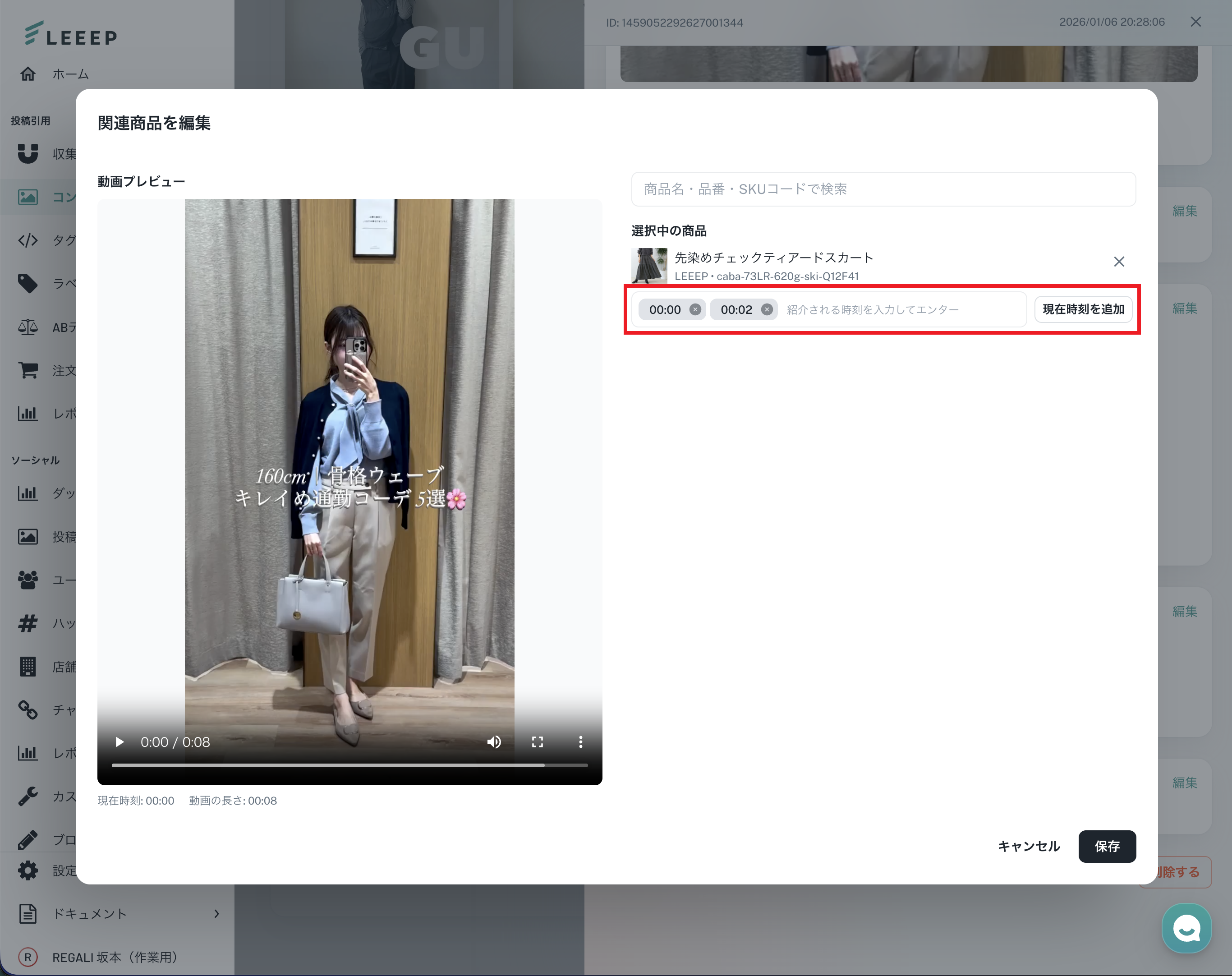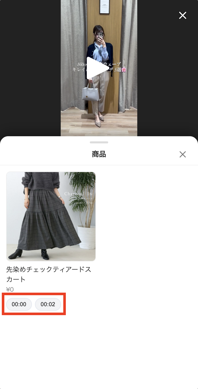 設定後の表示: 時刻を設定した商品は「ショート動画リストタグ」上に反映されます。表示された時刻をタップすると、そのシーンから動画を再生できます。