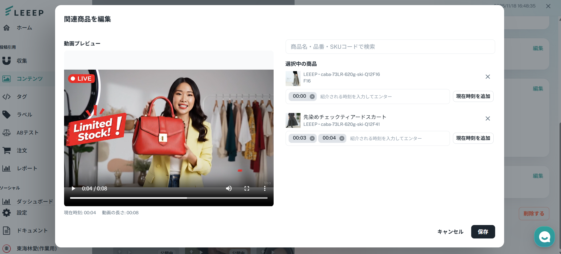 商品ごとに、動画内でその商品が登場する時刻を設定します。