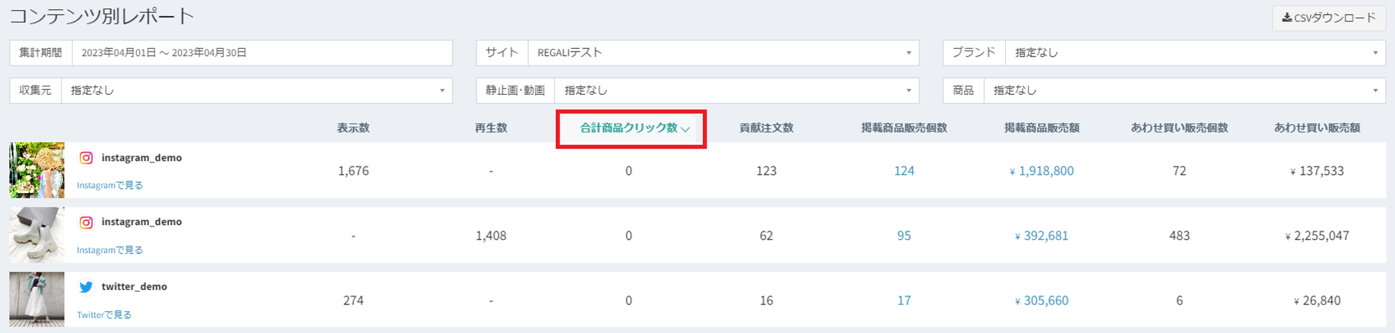 コンテンツ別レポート画面で、「コンテンツ経由の商品クリック数」を確認できるようになりました!どのコンテンツを経由して商品が見られているのかを一目でチェックすることができます。コンテンツ運用の分析・改善にお役立てください。