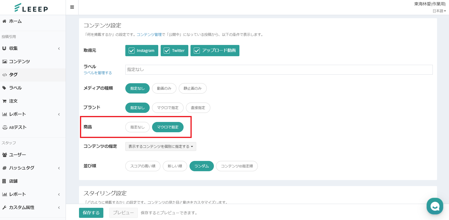 コンテンツ設定の箇所にて、「商品」の項目を「マクロで指定」に設定してください。