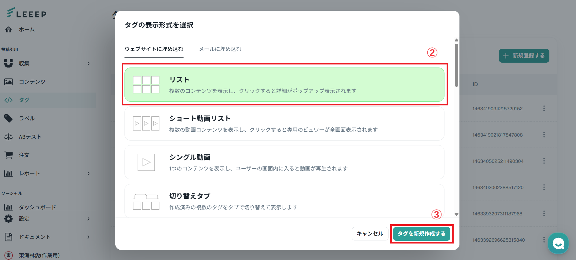 タグ画面の「新規登録する」ボタンをクリックし、表示形式を選択してから「タグを新規作成する」をクリックしてください。
