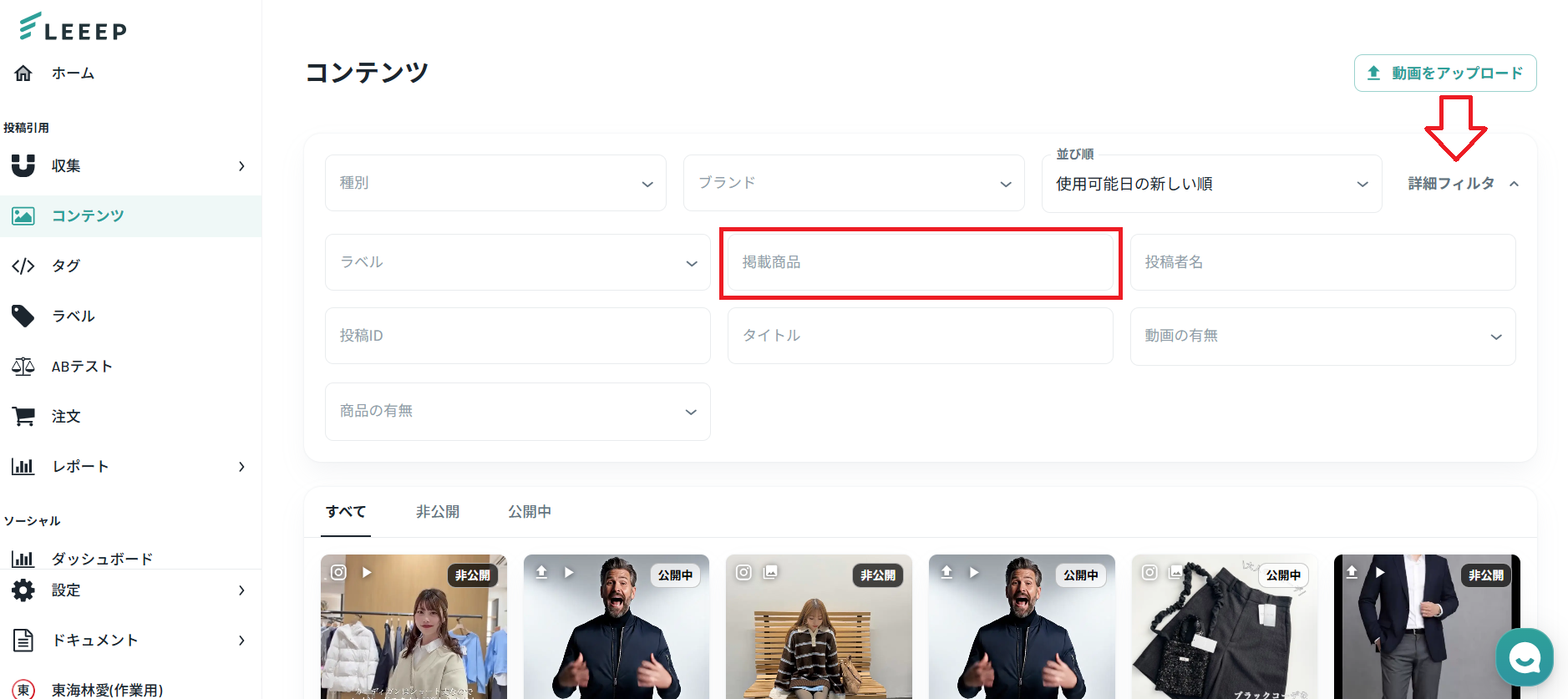 ①コンテンツ画面の[詳細フィルタ]をクリックし、「掲載商品」欄に商品番号または商品名を入力して絞り込みます。