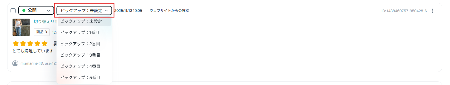 公開中のレビューにピックアップ設定を行うことで、商品ページのレビュー一覧で先頭に固定表示できます。