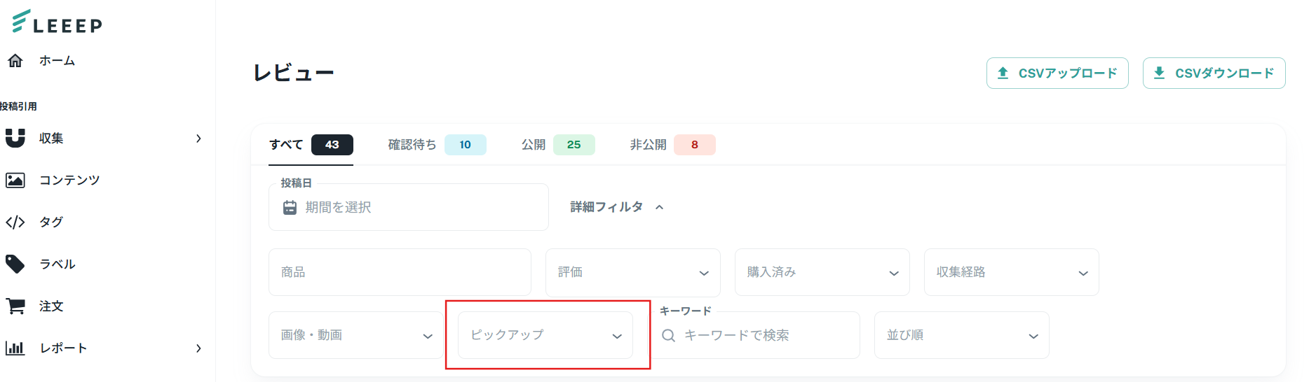 管理画面上で、ピックアップレビューのみ検索する絞り込みが可能です。