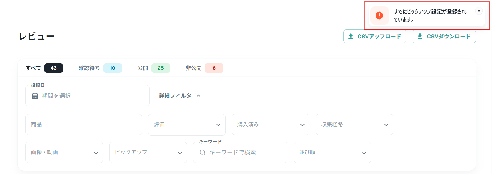 同一商品に対して、同一固定場所(例:ピックアップ1番目)にレビューを複数固定しようとすると、後から設定しようとしたレビューは設定できず、エラーとなります。