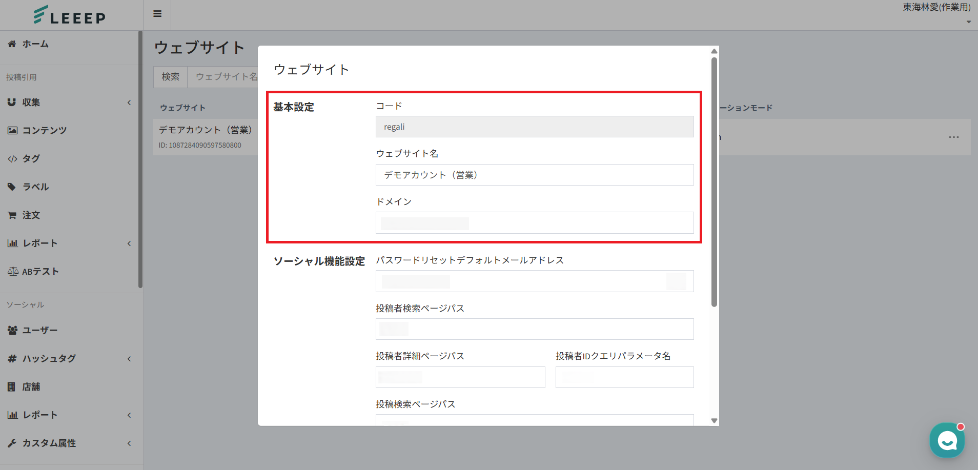 コード | ウェブサイトのコード(編集不可)※ウェブサイトIDとは異なります。 |