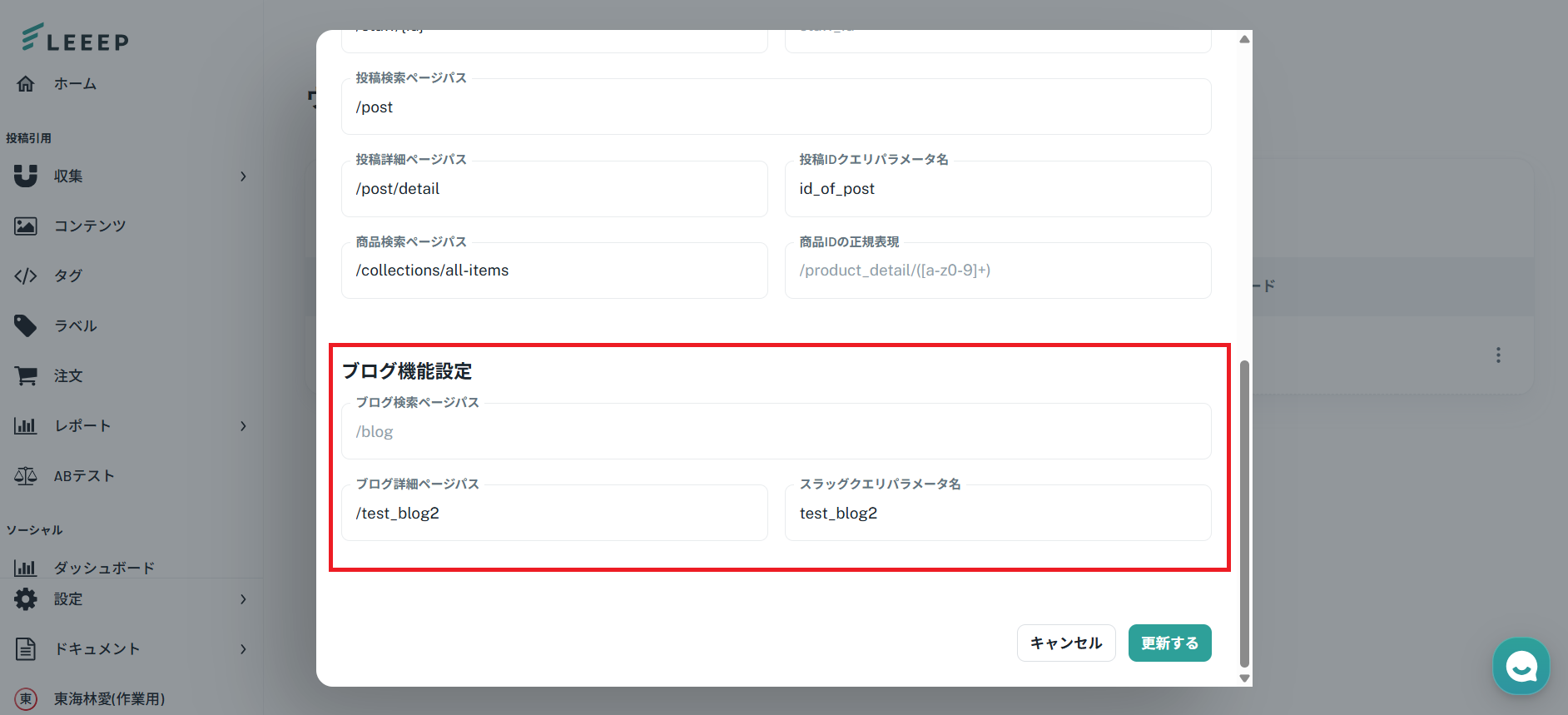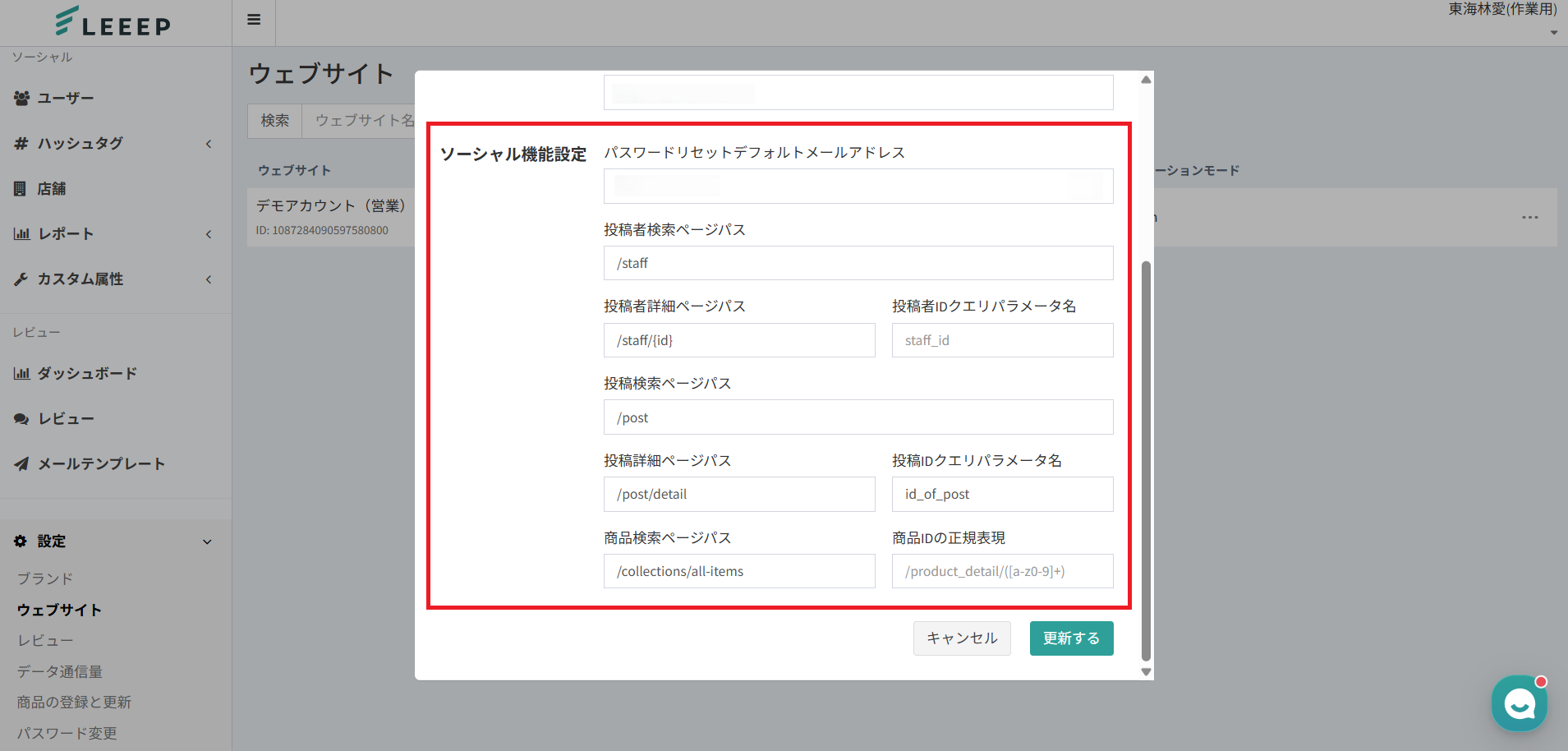 投稿詳細ページパス | ご用意していただいたソーシャル投稿詳細ページのパス (例)投稿詳細ページのURL:https://leeep.jp/post_detail?id=1234 →パスにあたる箇所:/post_detail |