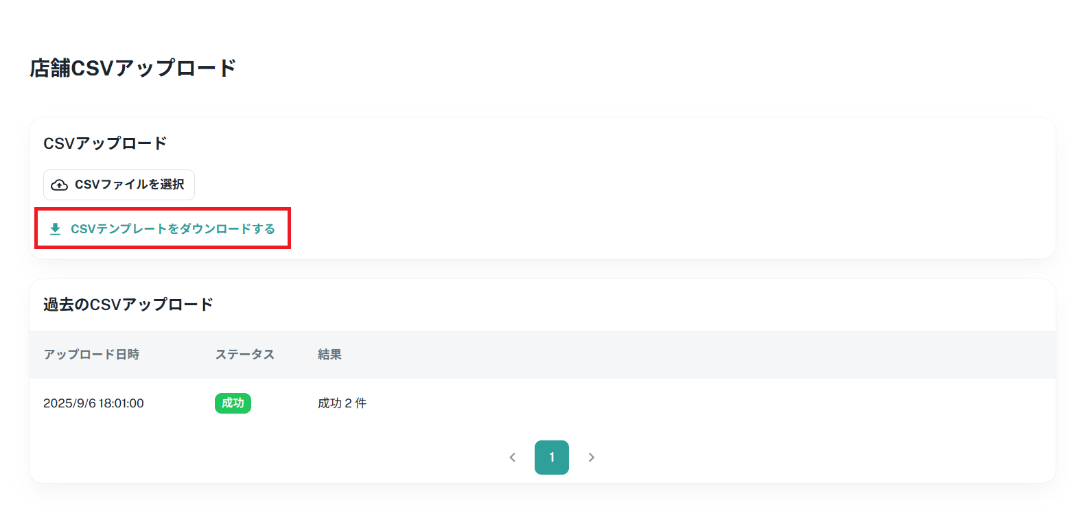 管理画面の「店舗CSVアップロードページ」でテンプレートダウンロードリンクをクリック
