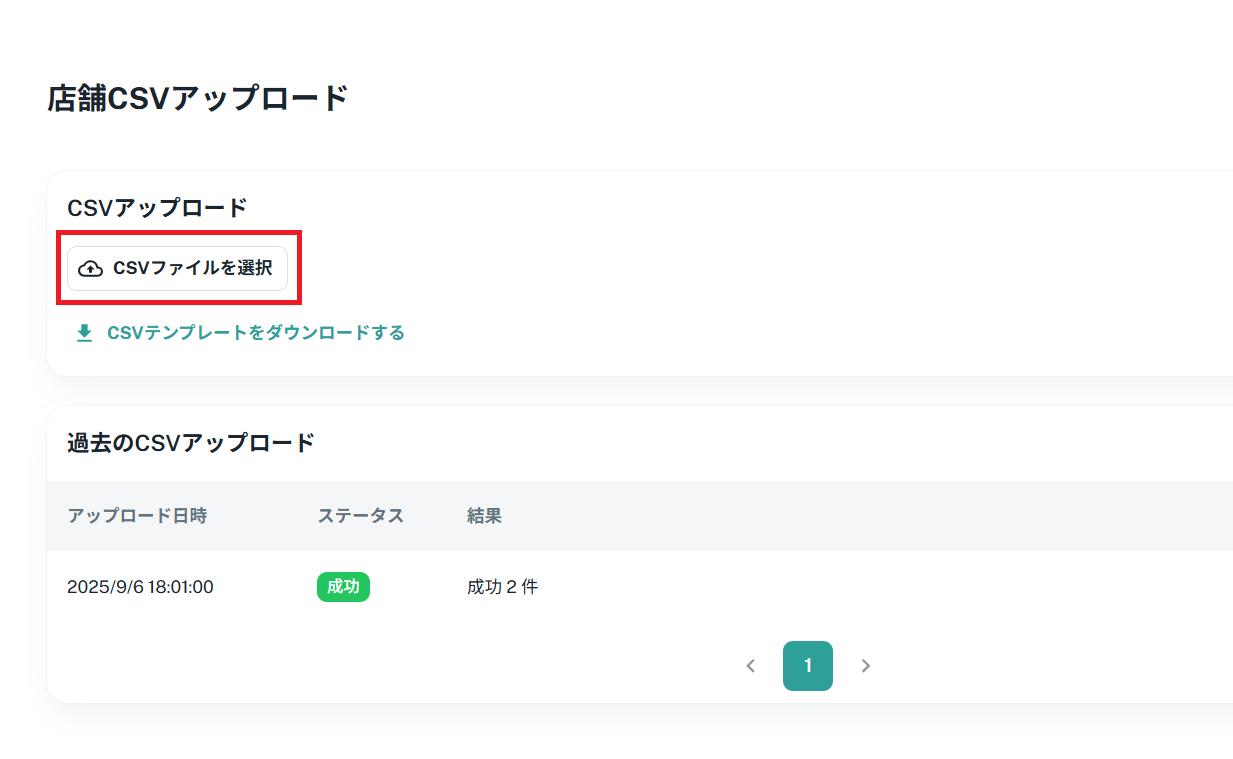 「店舗ページ」から「店舗CSVアップロードページ」へ遷移してCSVファイルをアップロードできます。