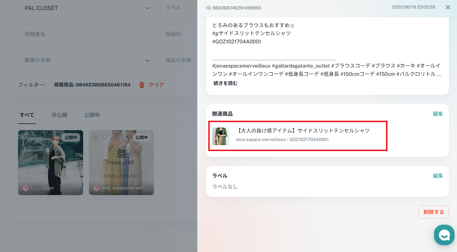 収集された投稿は、コンテンツページに移動した時点で、該当する商品が自動的に紐付いた状態になります。
