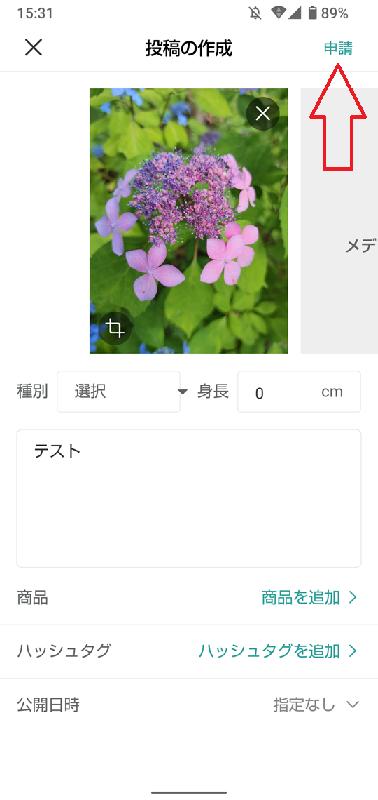 ③各フォームに情報を追加し、右上の「申請」をタップして投稿を完了させます。