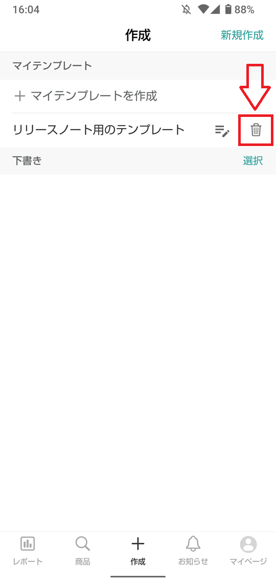①保存されているテンプレートの中から、削除したいテンプレートの右横にある「ゴミ箱アイコン」をタップします。