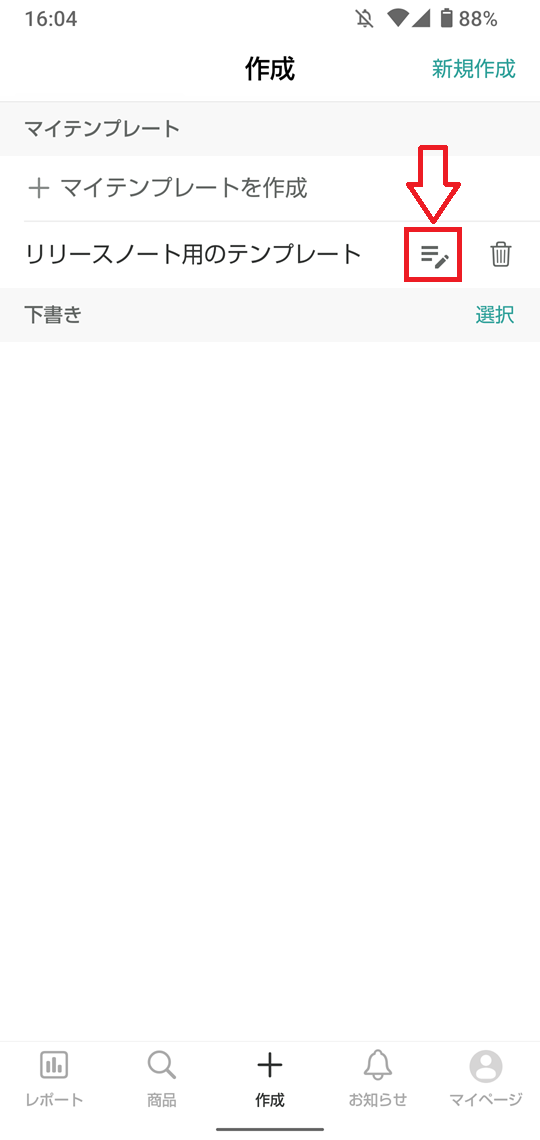 ①保存されているテンプレートの中から、編集したいテンプレートの右横にある「編集アイコン」をタップします。