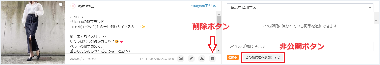 ②前のアカウントで収集された各コンテンツの「この投稿を非公開する」ボタンをタップして投稿を非公開にする