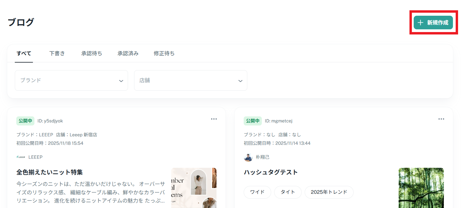 新規作成の場合:ブログ管理画面から「新規作成」ボタンをクリック