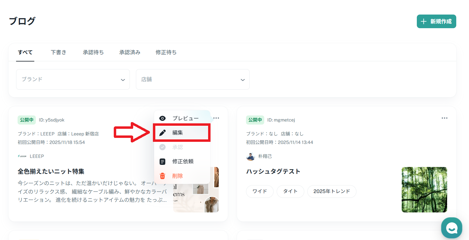 ブログ記事を編集する場合は、サンプル画像の矢印が示す「編集」をクリックしてください。