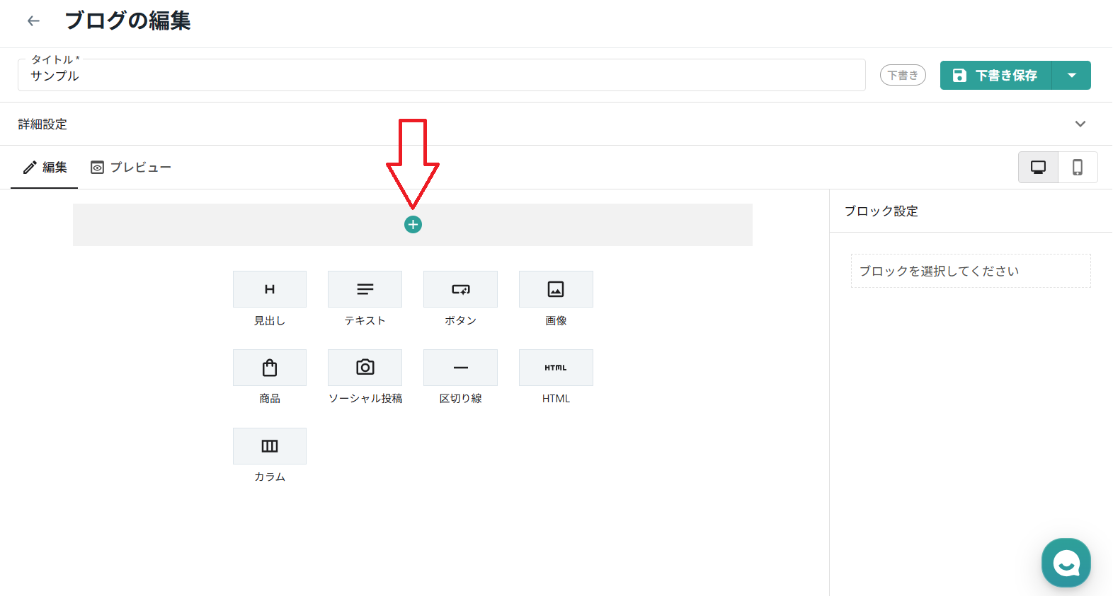 エディター画面に表示される「+」ボタンをクリックし、追加したいブロックタイプを選択します。