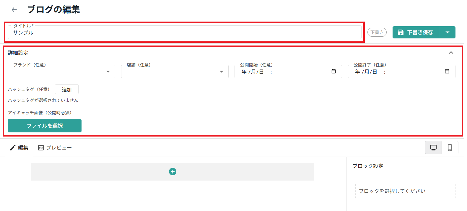重要:ブログエディターには自動保存機能はありません。こまめに「下書き保存」ボタンをクリックして作業内容を保存してください。