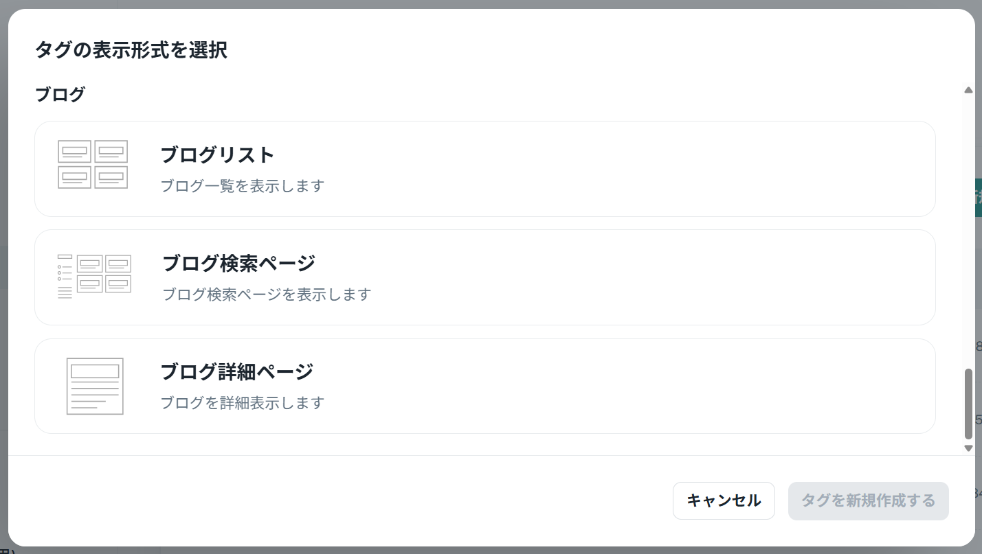 タグの表示形式で「ブログ検索ページ」 「ブログ詳細ページ」を選択した場合に設定可能です。