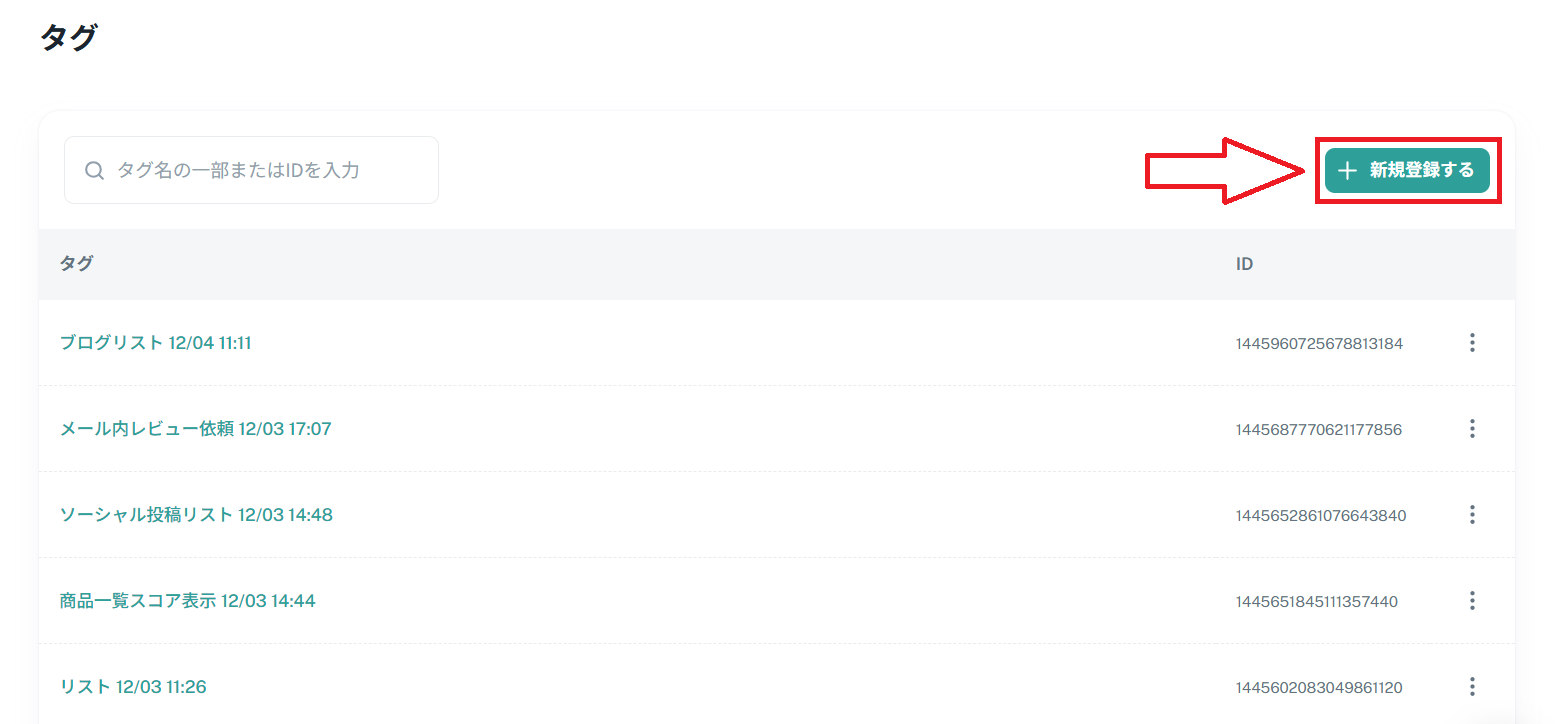 タグ画面のサンプルです。赤枠で囲まれた「新規作成」ボタンからタグを作成できます。