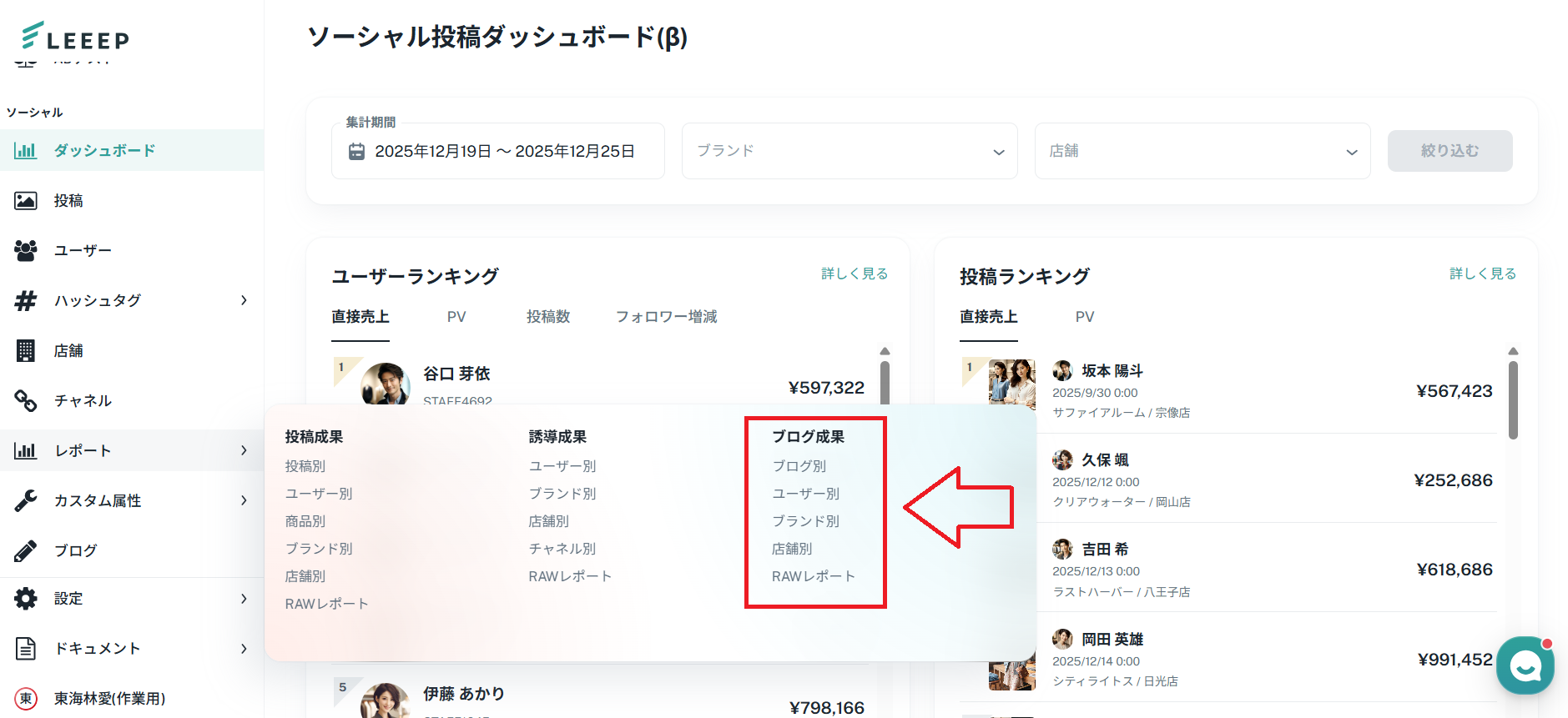 管理画面の左メニューから 「ソーシャル」>「レポート」>「ブログ成果」 を選択し、目的に合わせたレポートをクリックしてください。