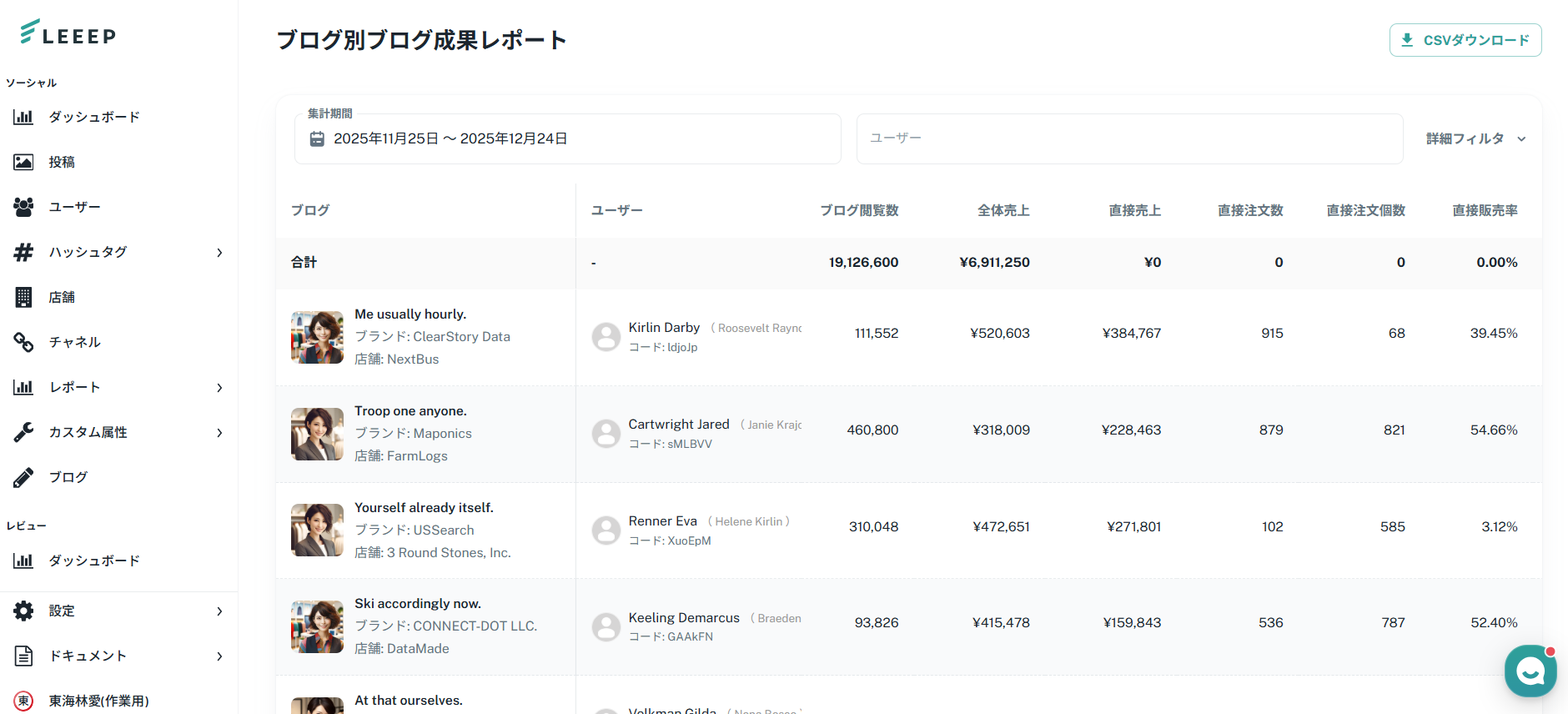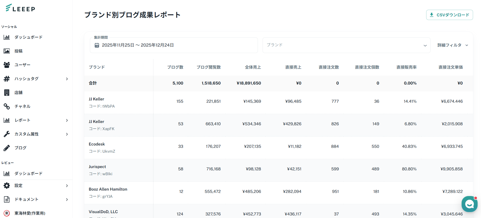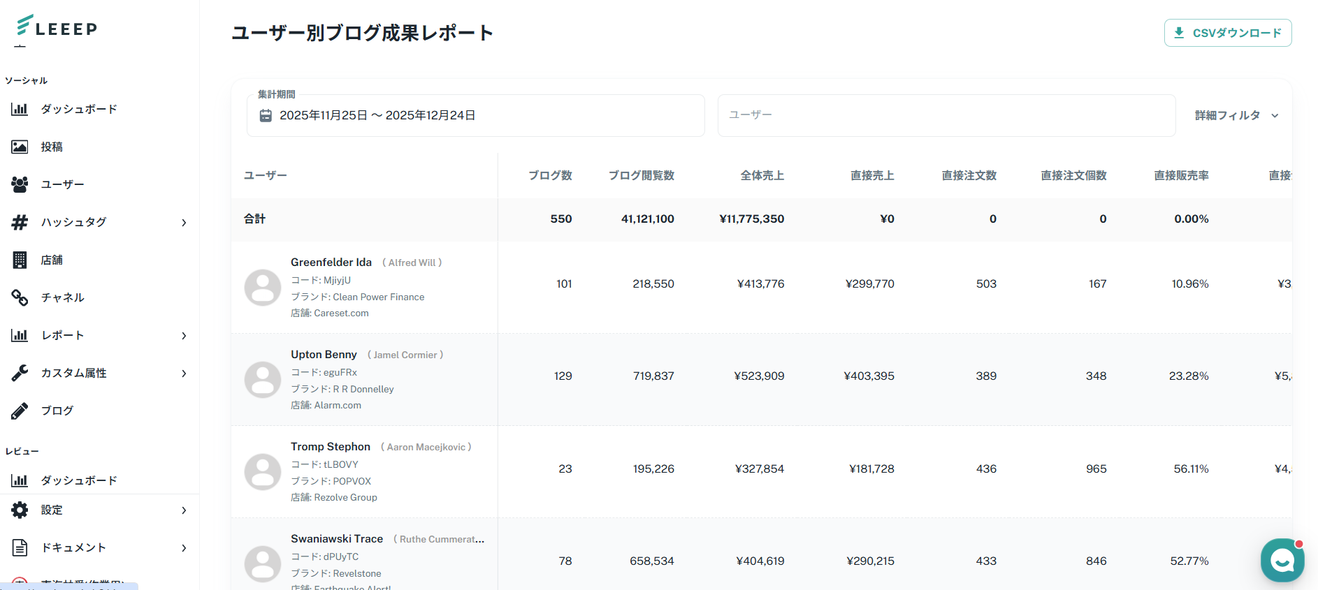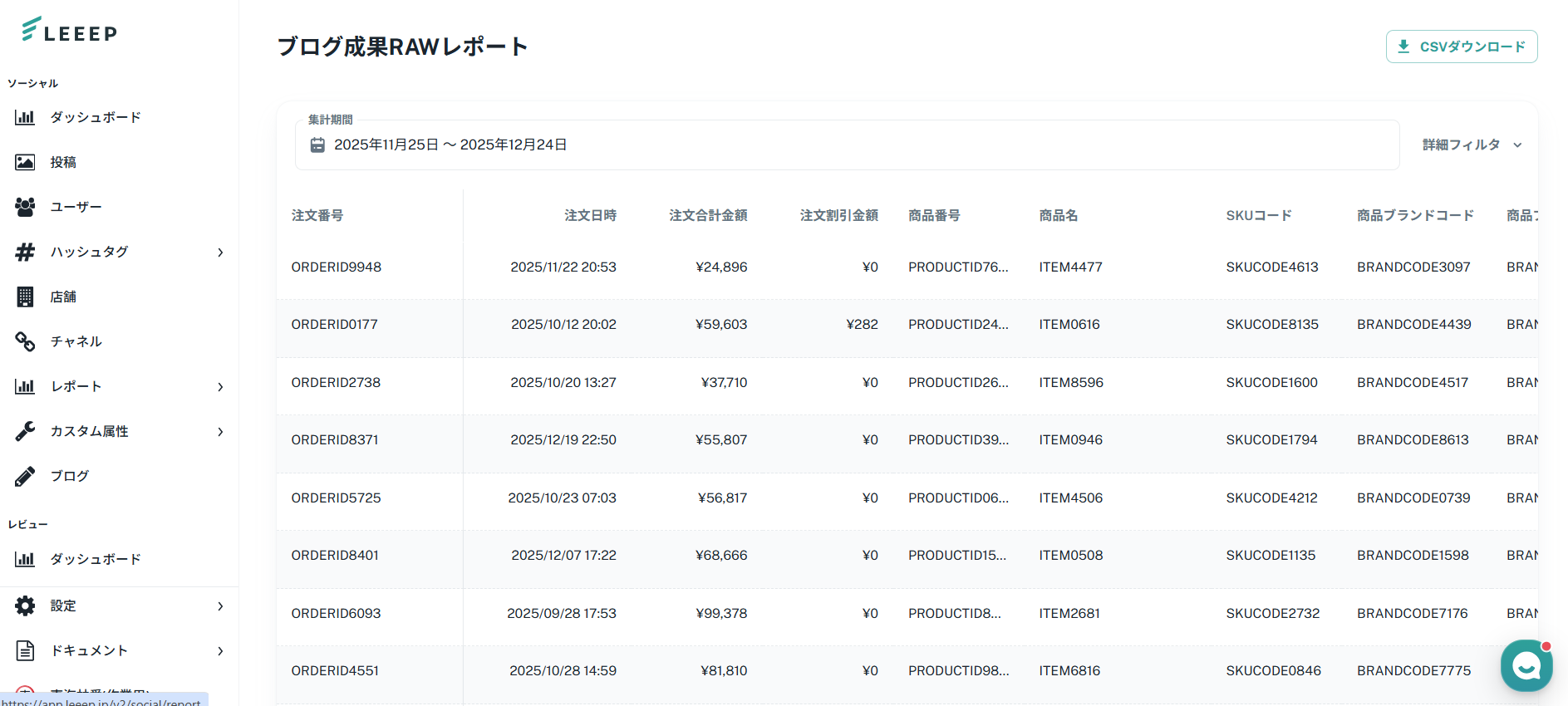 すべてのブログ成果に関する詳細な生データを確認できます。ExcelやBIツールでの自由な分析や、外部報告用のデータ作成に最適で、より深い分析が必要な場合に活用します。