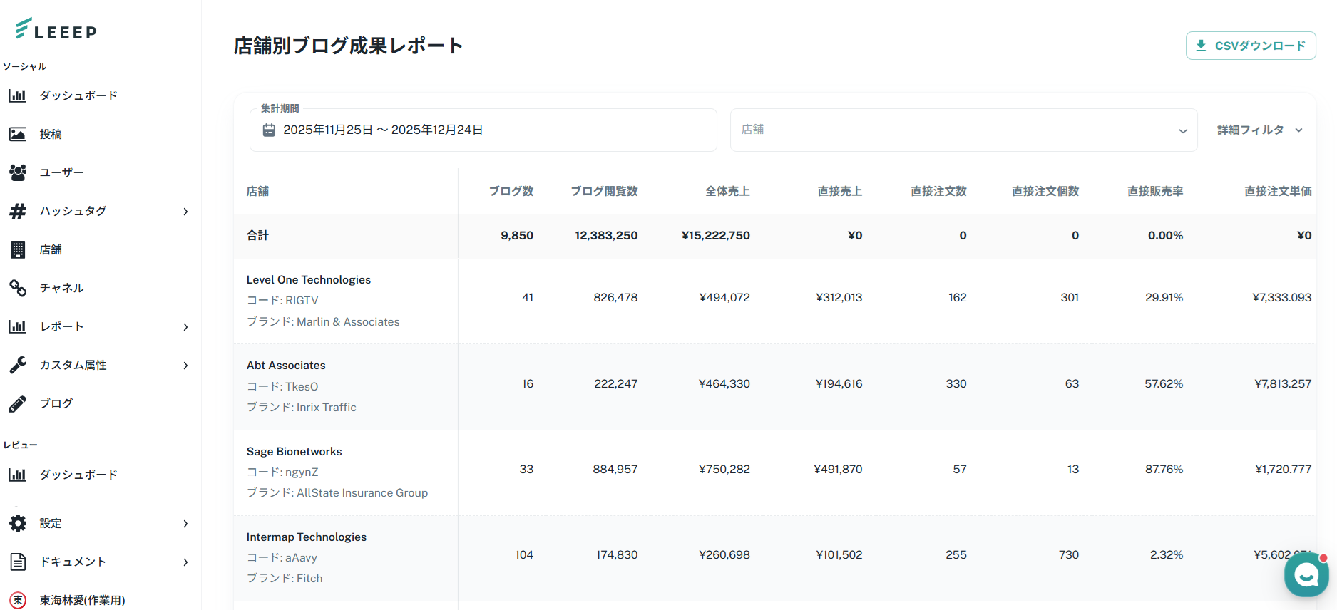 店舗ごとのブログ活動成果を比較できます。どの店舗が効果的なブログ運営を行っているかを把握し、成功店舗のベストプラクティスを他店舗に展開することで、全体のレベルアップを図ることができます。