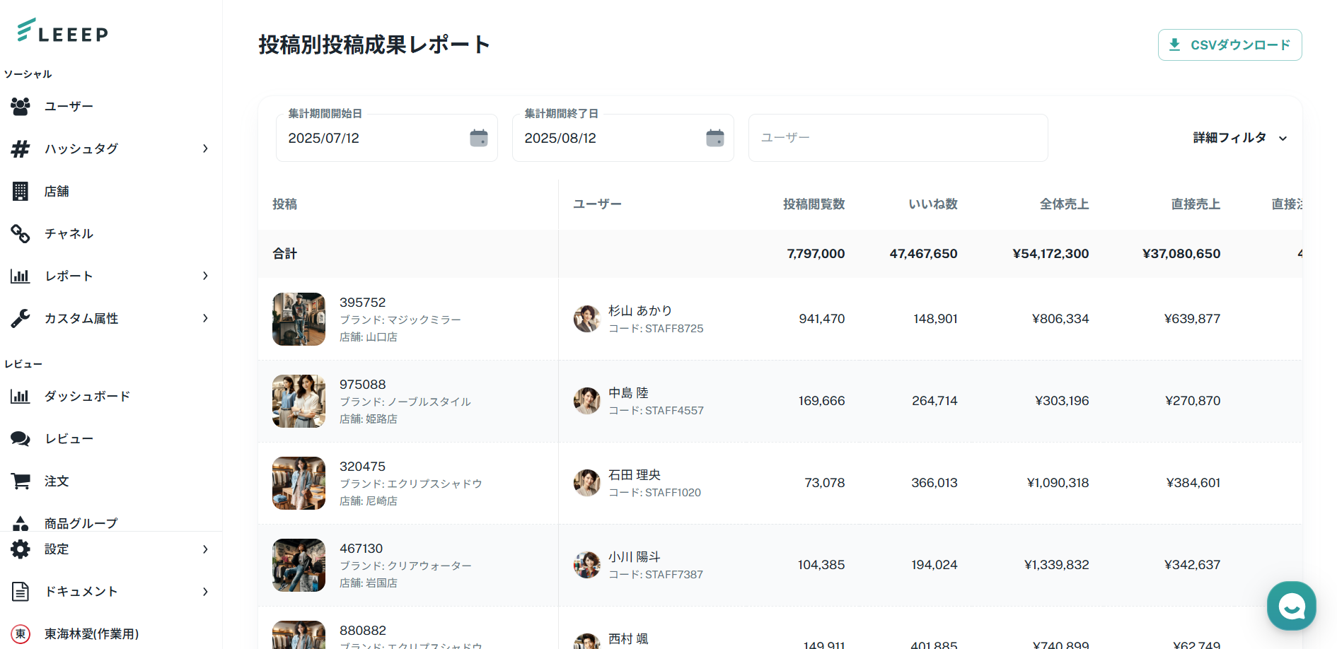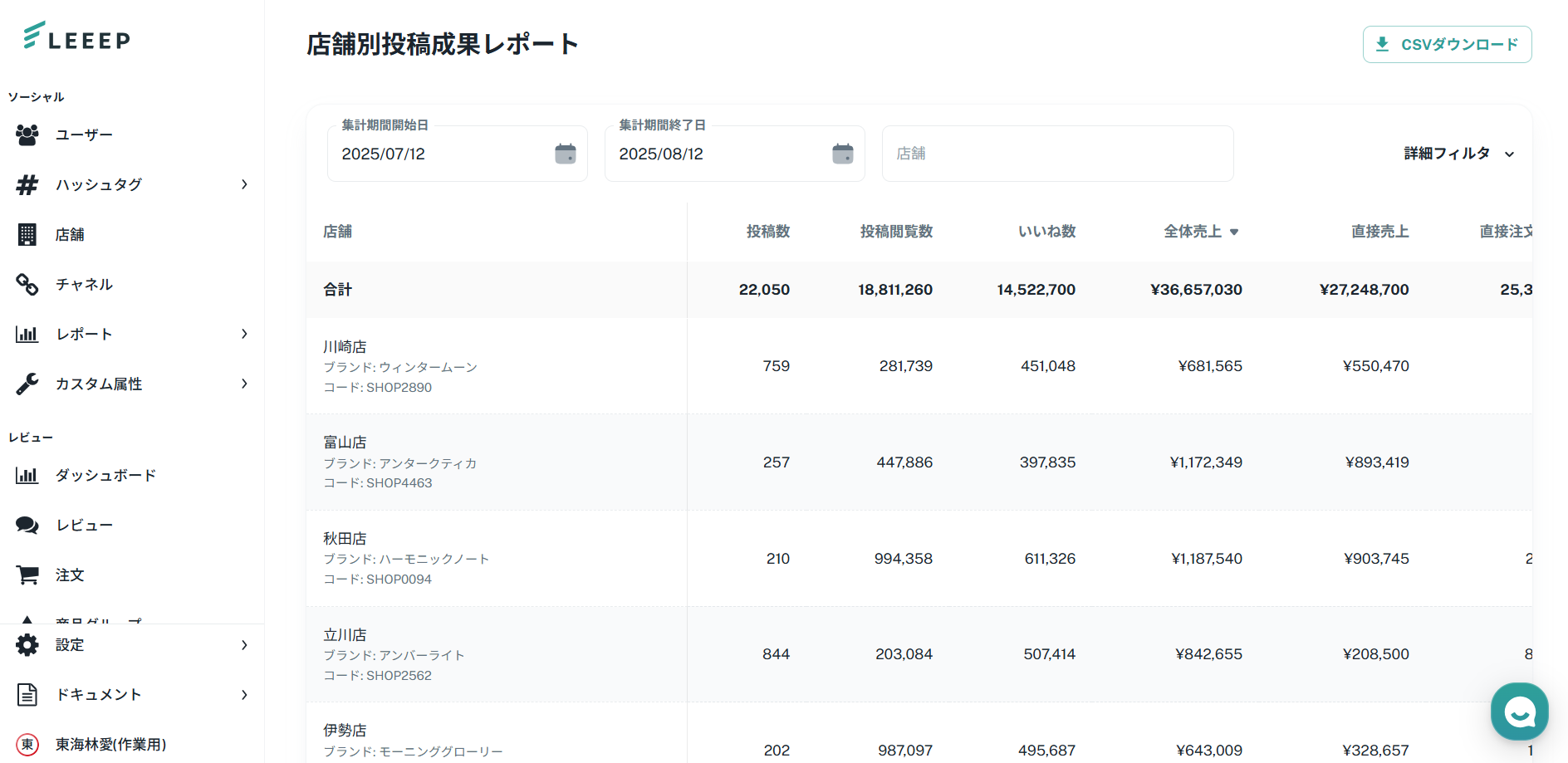 店舗別投稿成果レポートでは、指定した期間における店舗ごとの投稿成果を確認することができます。