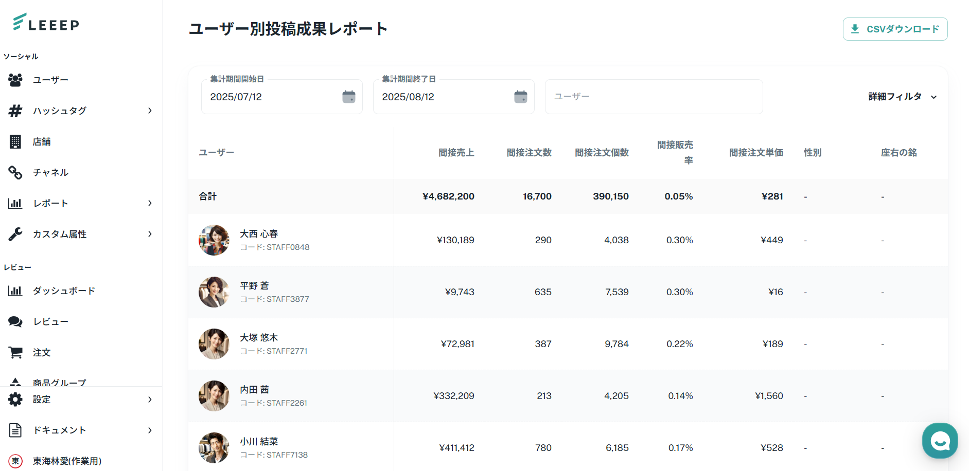 ユーザー別投稿成果レポートでは、指定した期間におけるユーザーごとの投稿成果を確認できます。