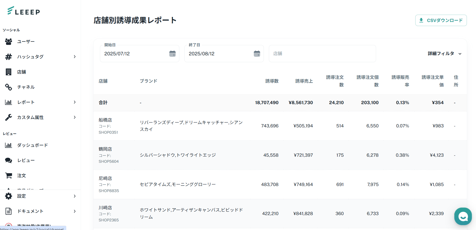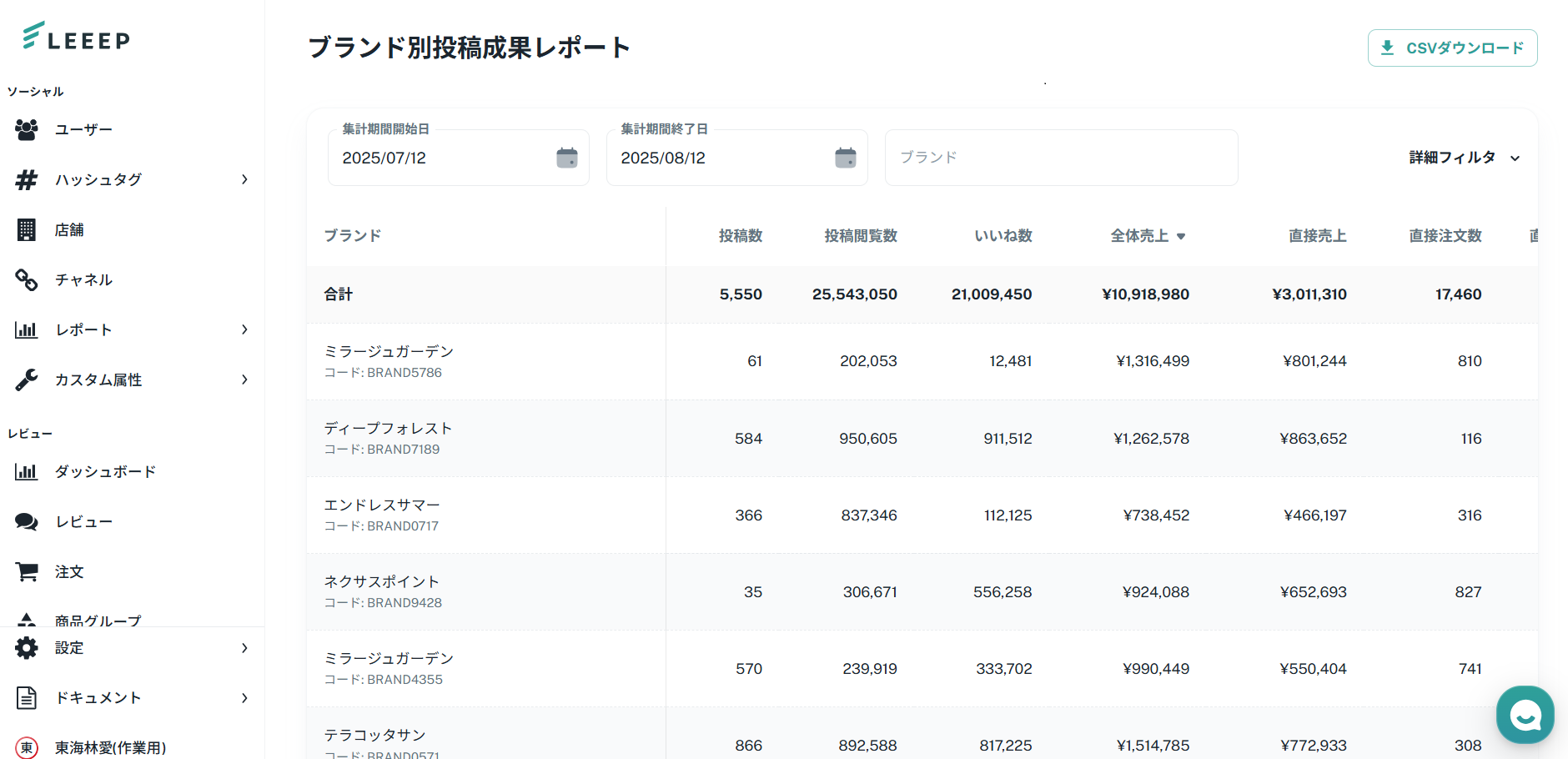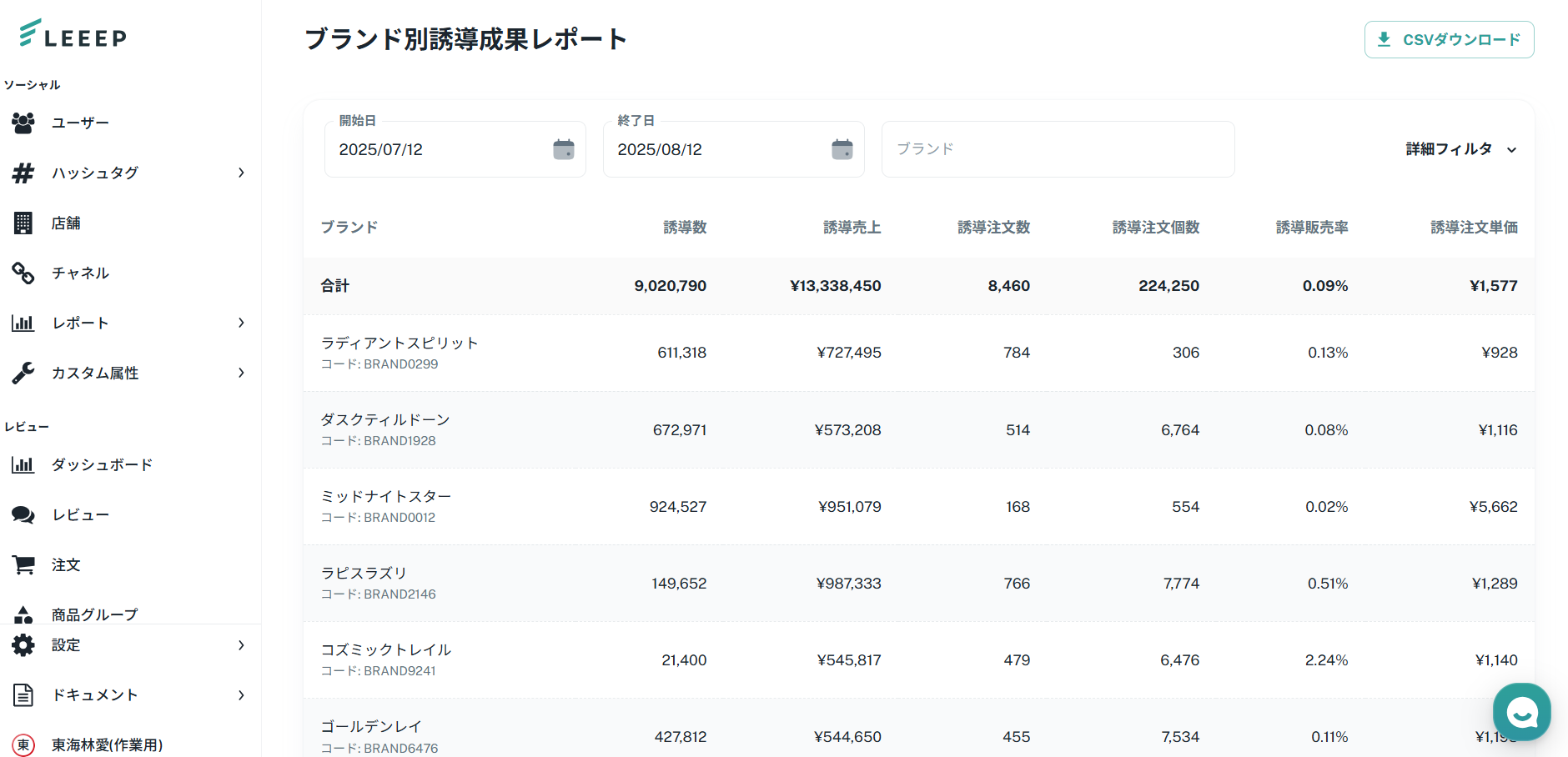 ブランド別投稿成果レポートでは、指定した期間におけるブランドごとの誘導成果を確認することができます。
