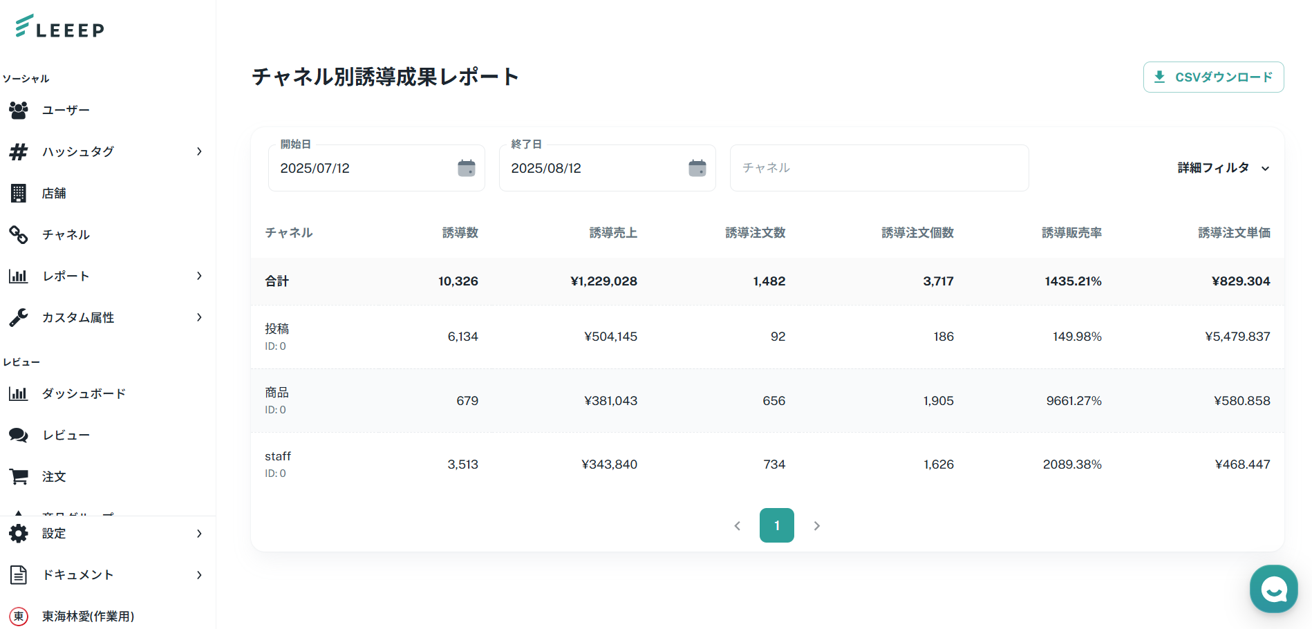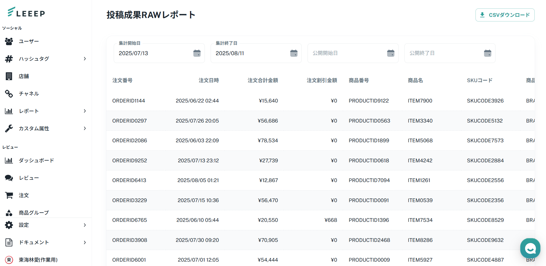投稿成果RAWレポートでは、LEEEPで計測される「注文番号 × SKU × 投稿ユーザー」ごとの売上データを確認できます。
