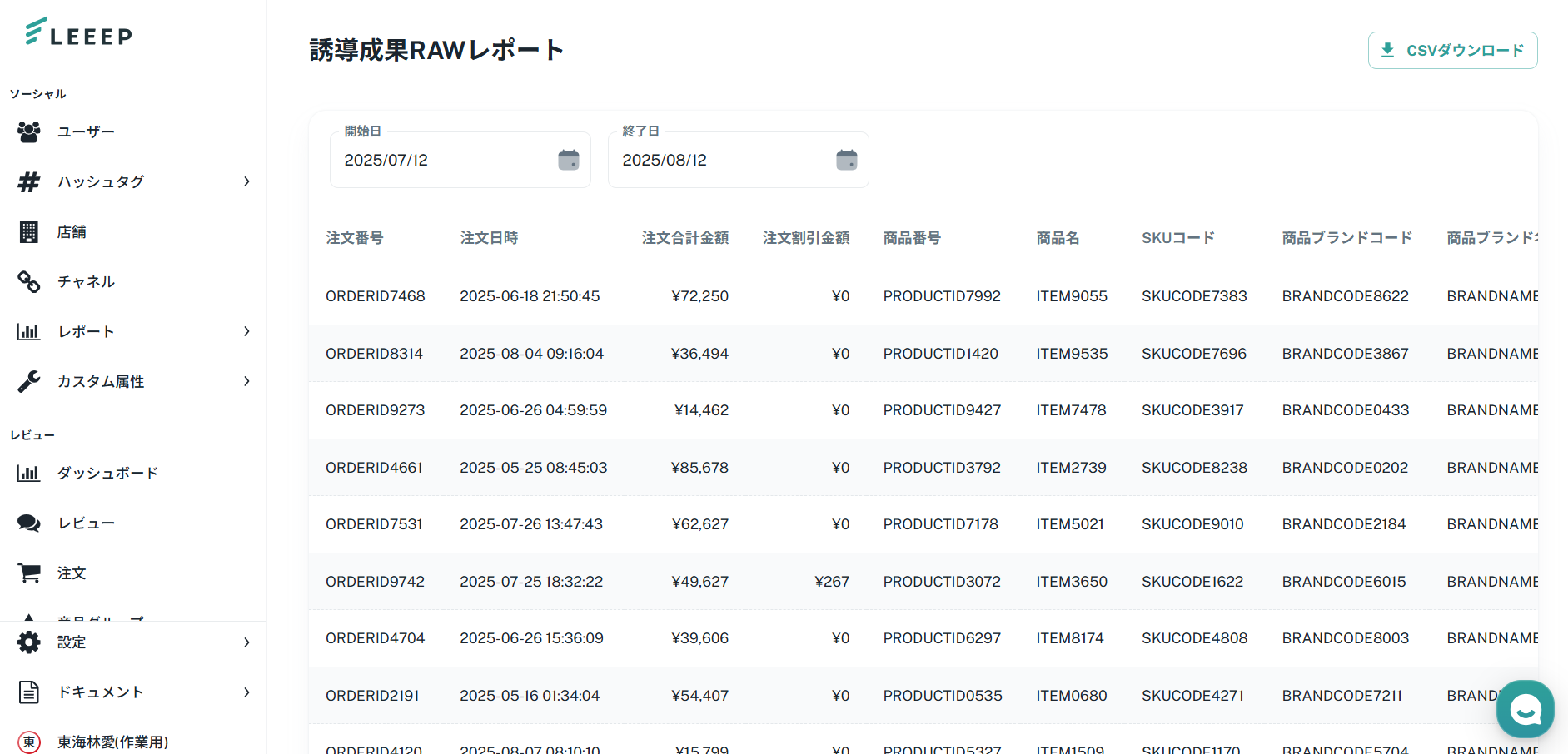 誘導成果RAWレポートでは、LEEEPで計測される「注文番号 × SKU × 誘導ユーザー」ごとの売上データを確認できます。