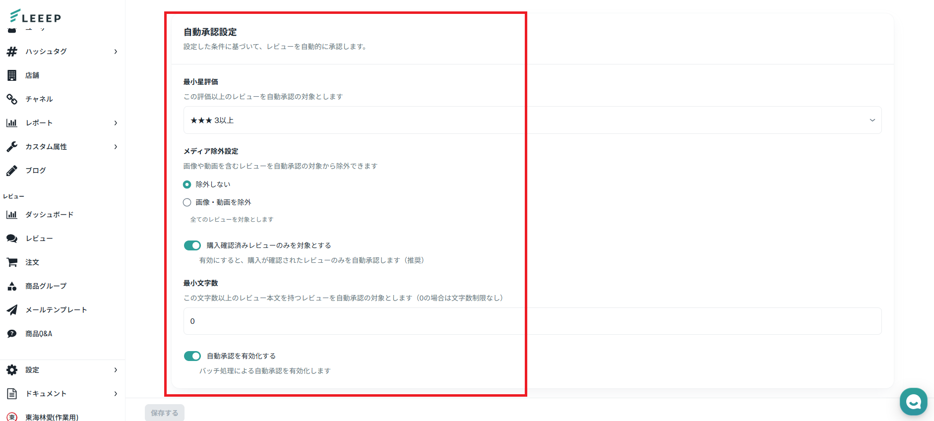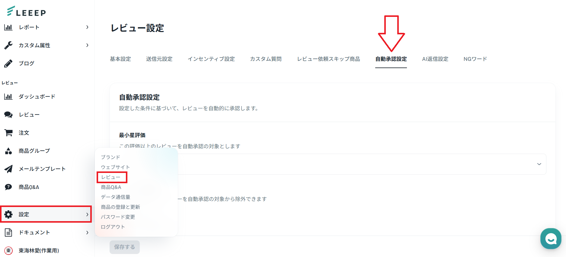 LEEEP管理画面: 設定 > レビュー > 「自動承認設定」タブ