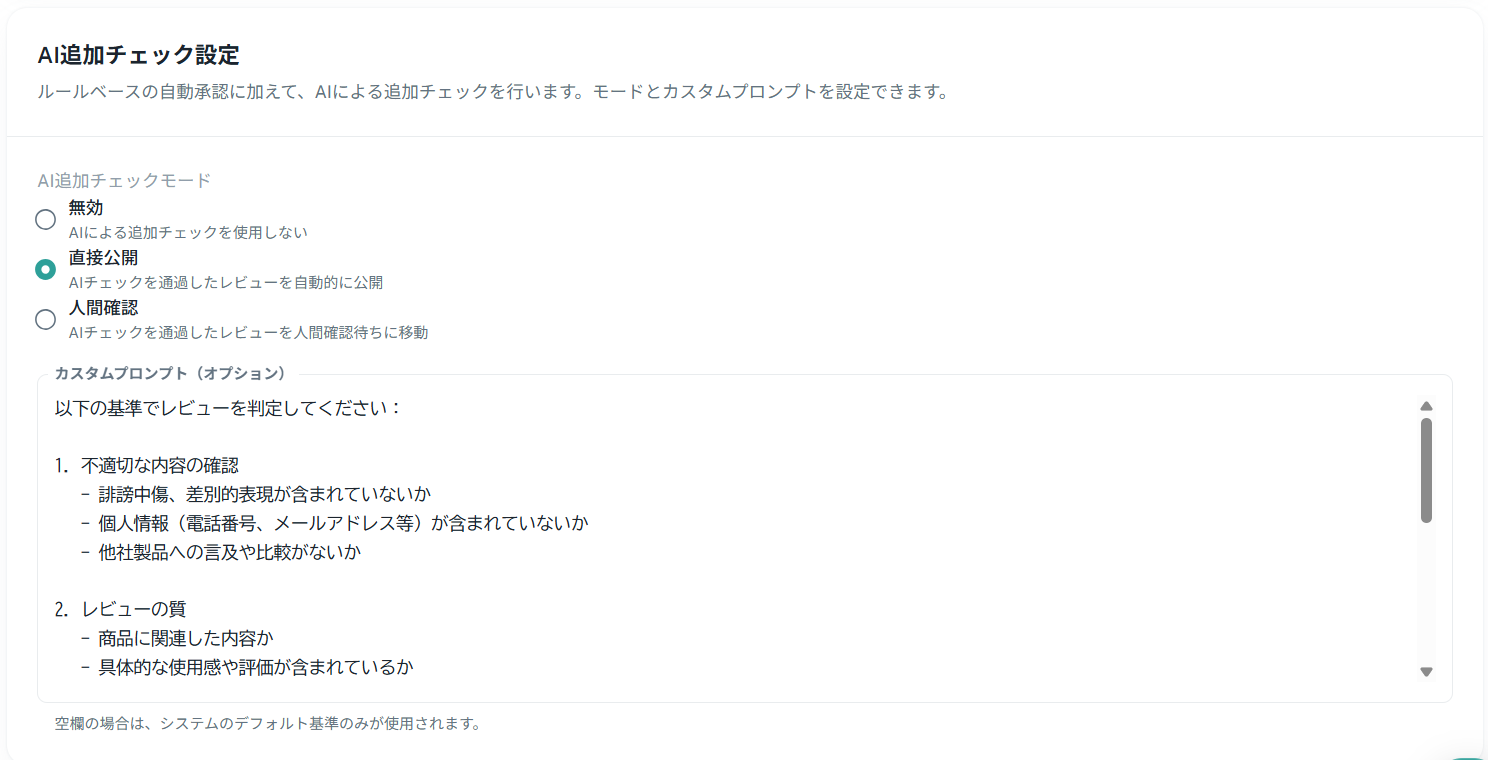 直接公開:AIが承認と判定したレビューを即座に公開します。