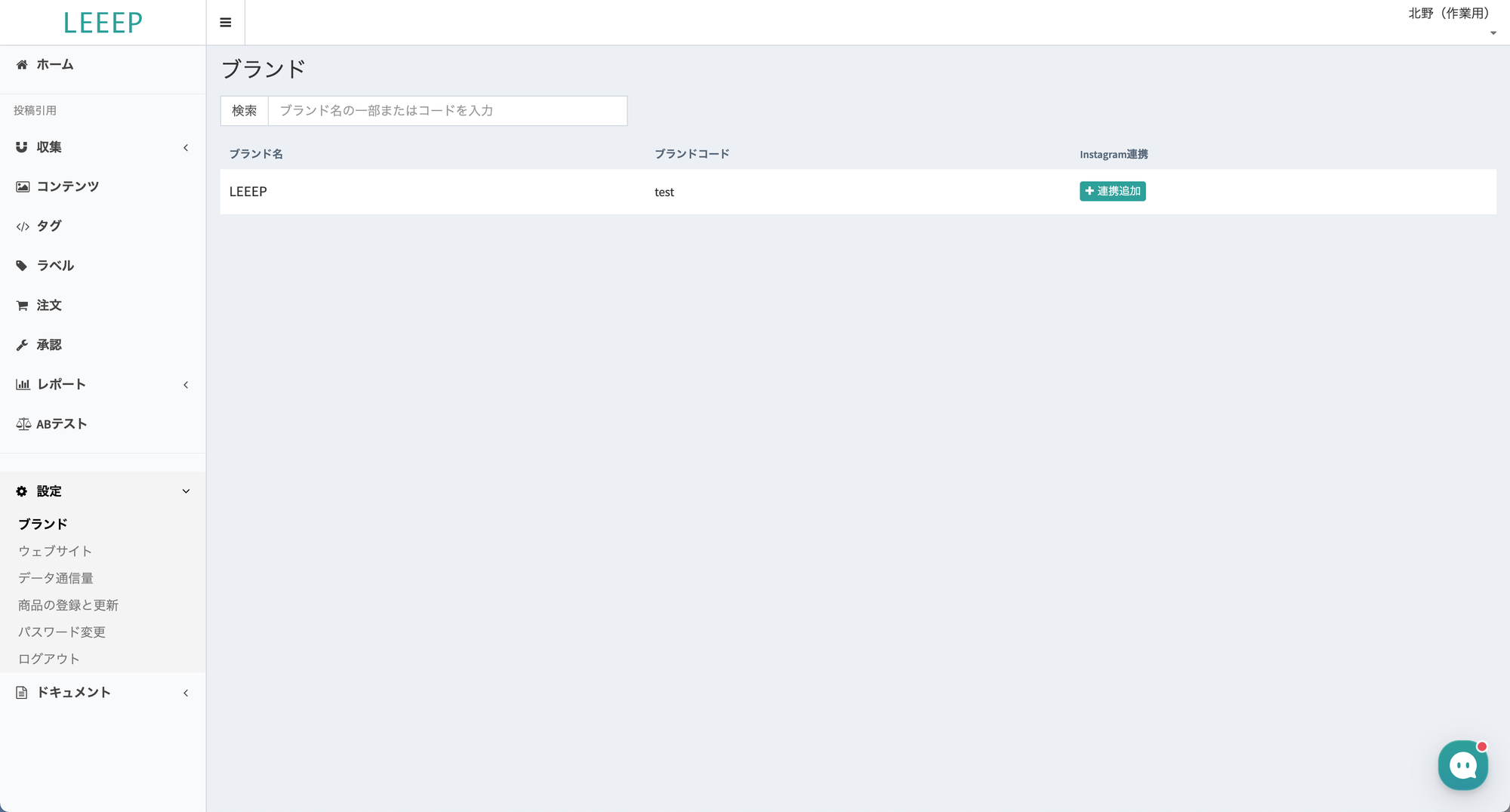 管理画面「設定」>「ブランド」のページを開き、Instagram連携の箇所にある「連携追加」をクリックしてください。