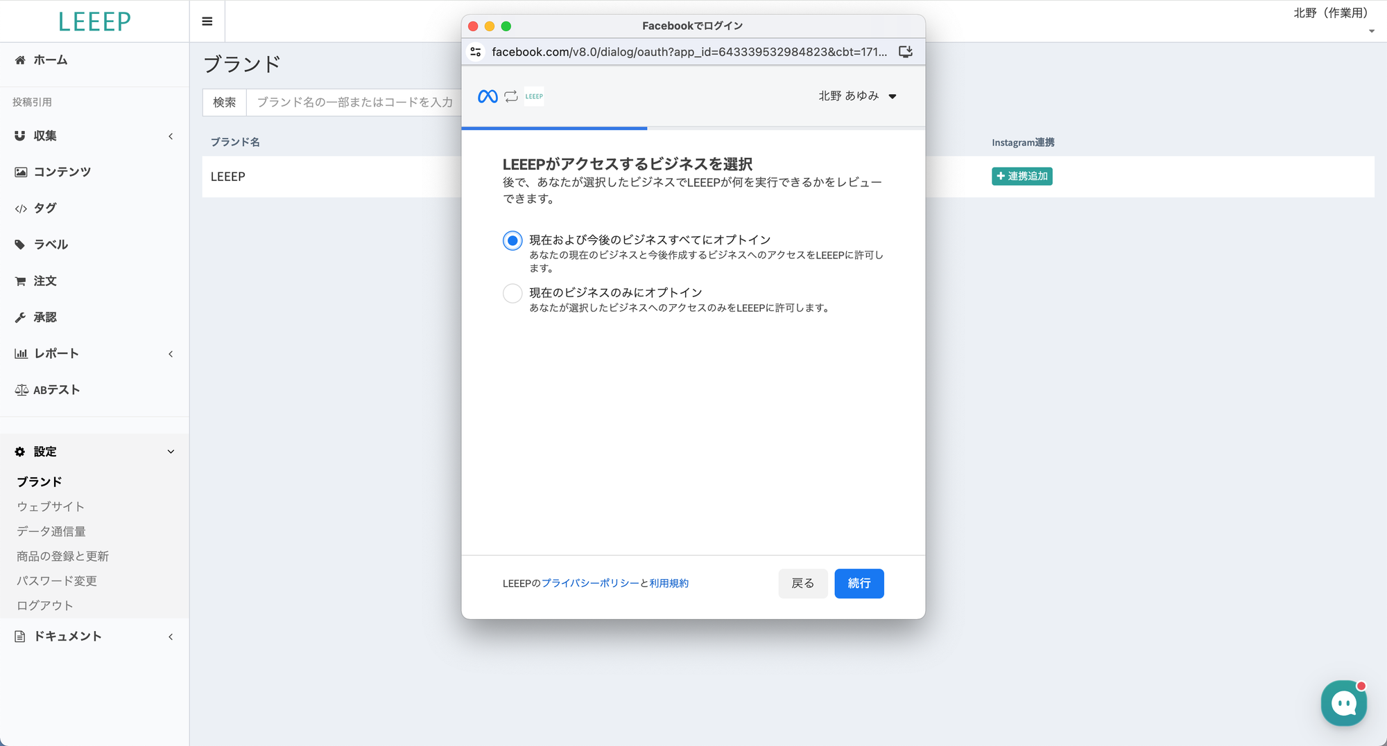 「現在および今後のInstagramアカウントすべてにオプトイン」を選択するか、「現在のInstagramアカウントのみにオプトイン」で連携したいInstagramを選択した上で、「続行」を押下してください。