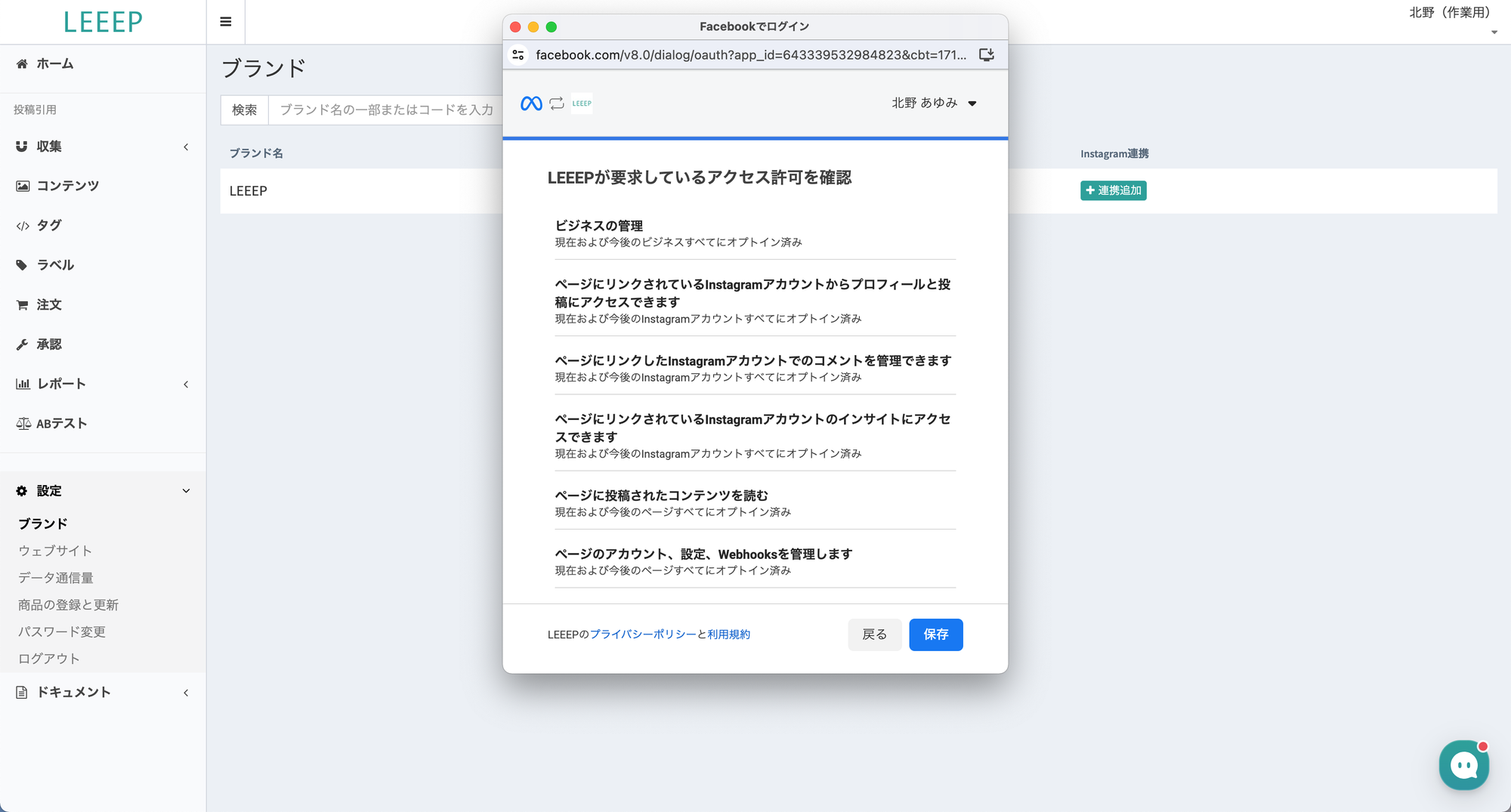 LEEEPへのInstagram連携を行う人が、Facebookページの管理者である