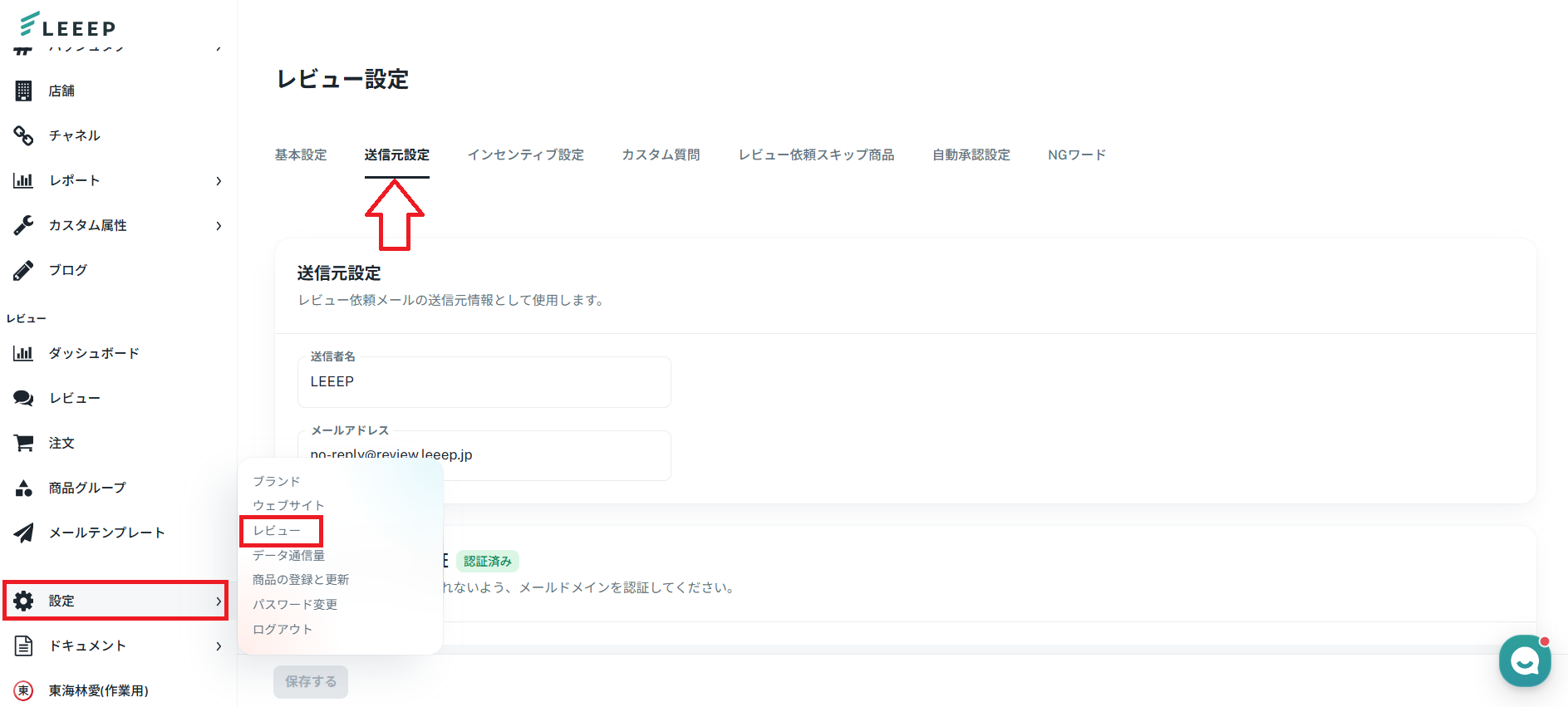 LEEEP管理画面: 設定 > レビュー > 「送信元設定」タブ