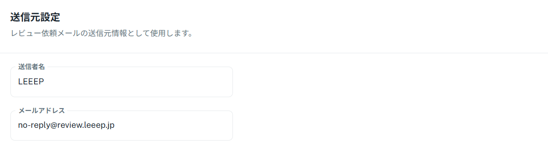 レビュー依頼メールの「送信者」として表示される情報を設定します。