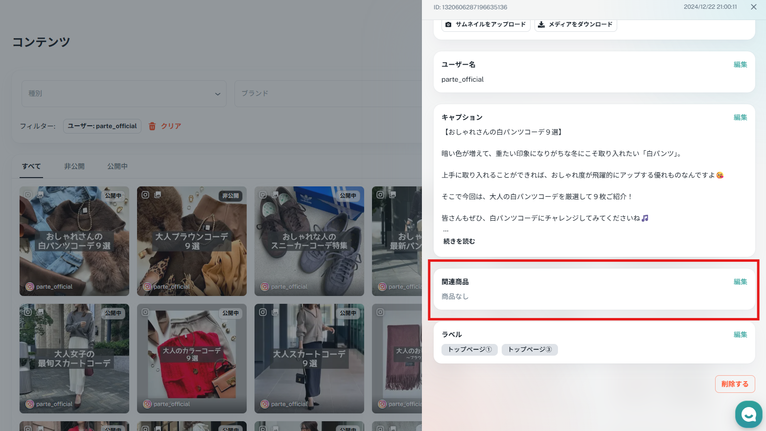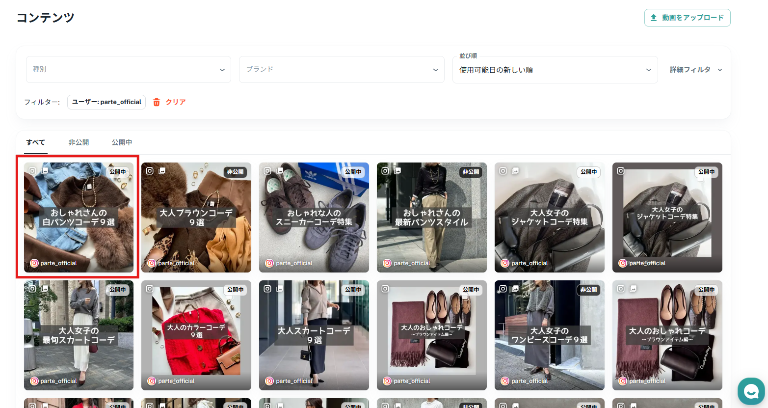 「コンテンツ」から、対象の投稿をクリックします。