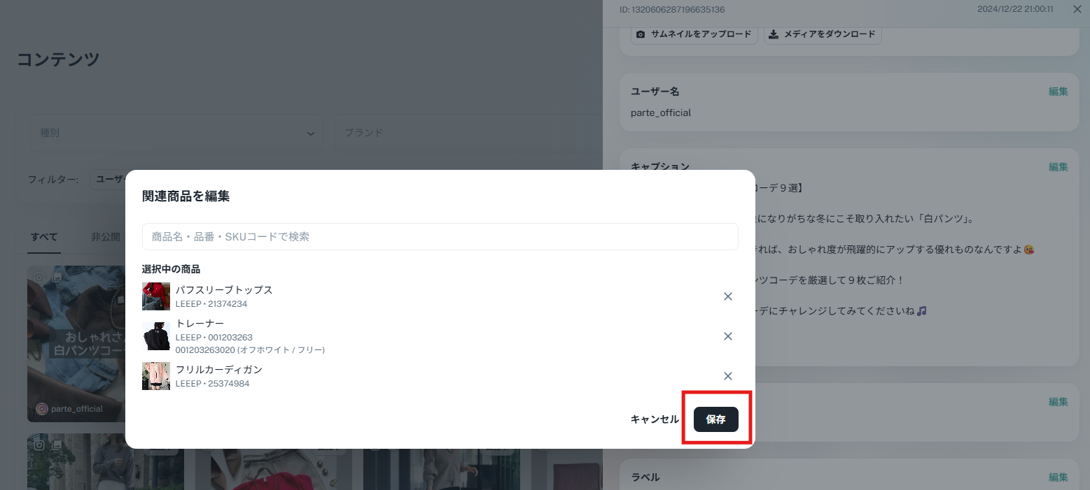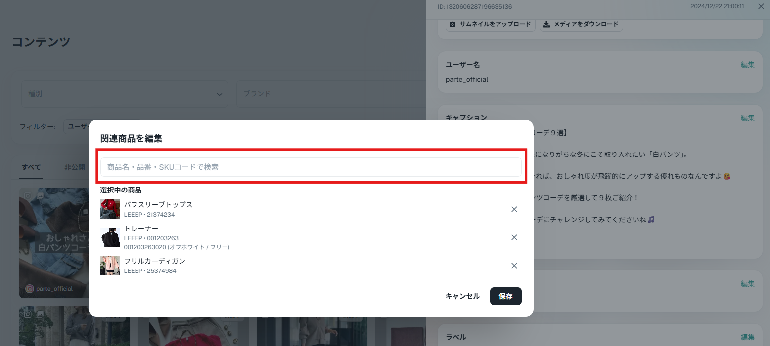 追加したい商品を検索し、複数選択します。