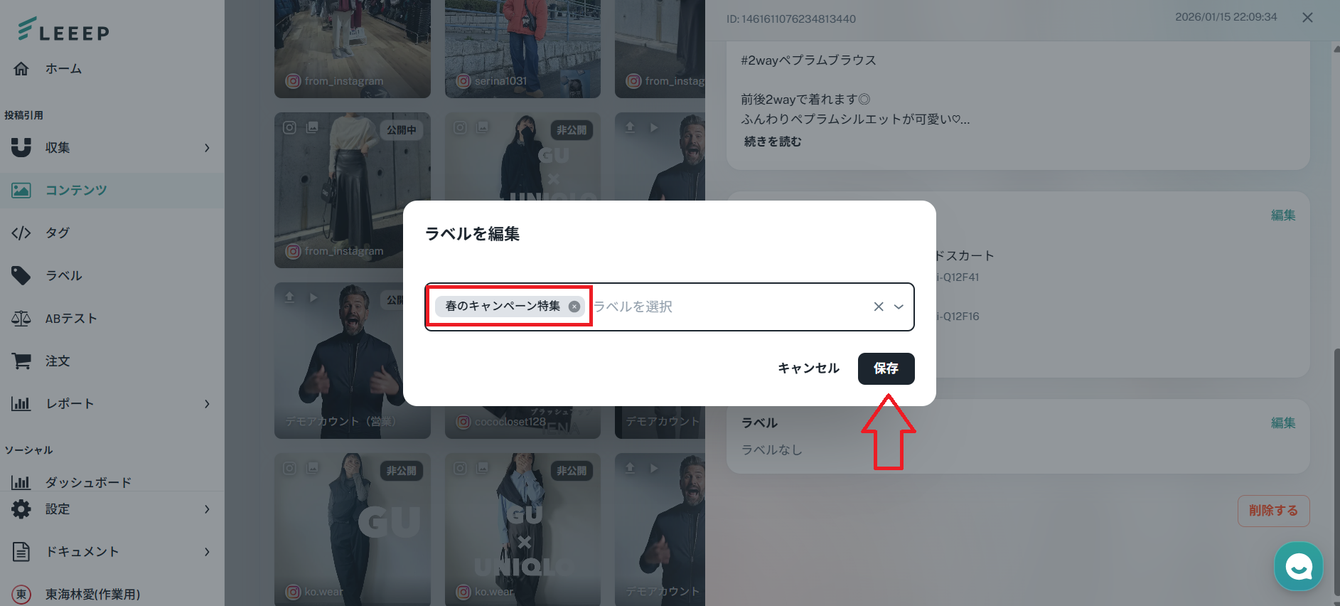 特集ページに掲載したいコンテンツに対し、「春のキャンペーン特集」ラベルを紐付けます。