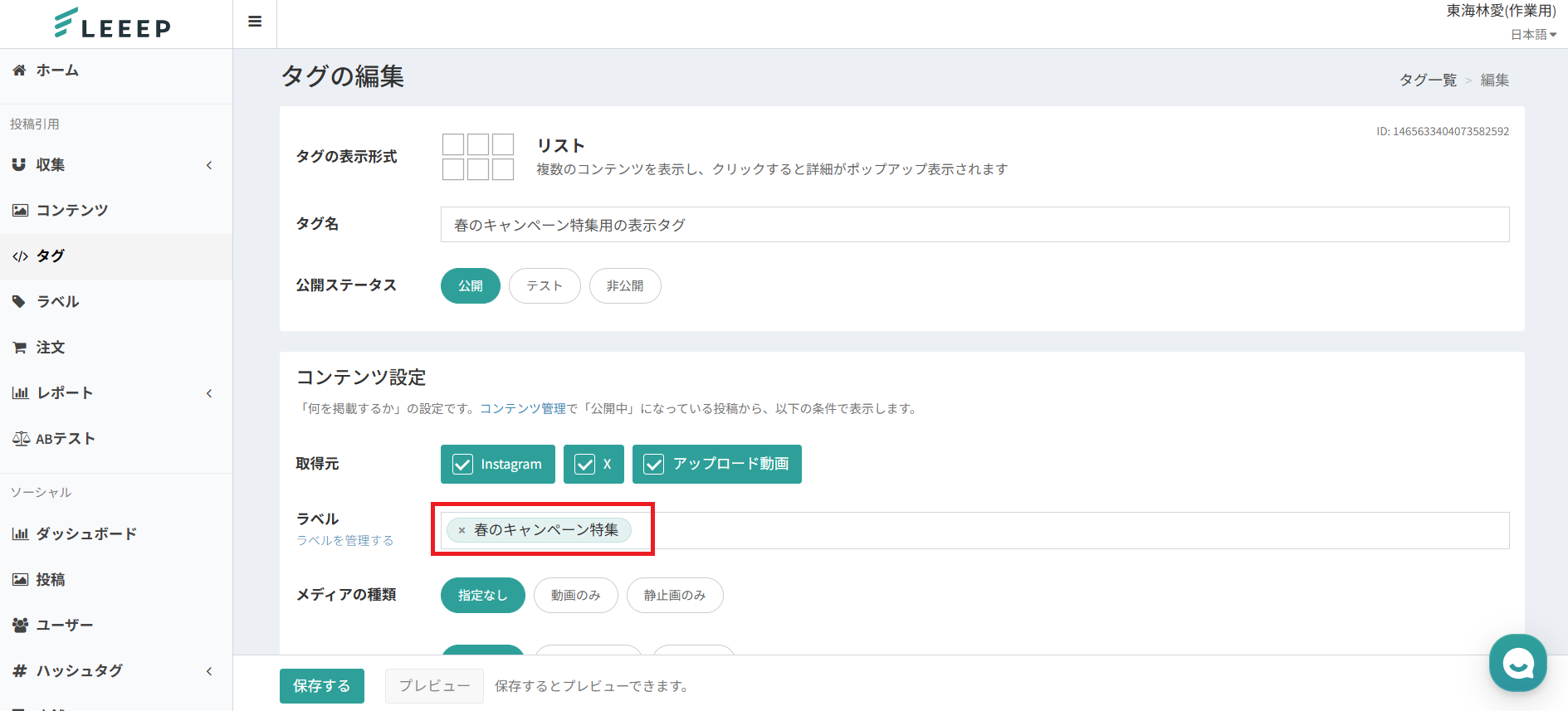 キャンペーン用に表示タグを新規作成し、「コンテンツ設定 > ラベル」の項目で「春のキャンペーン特集」を指定します。