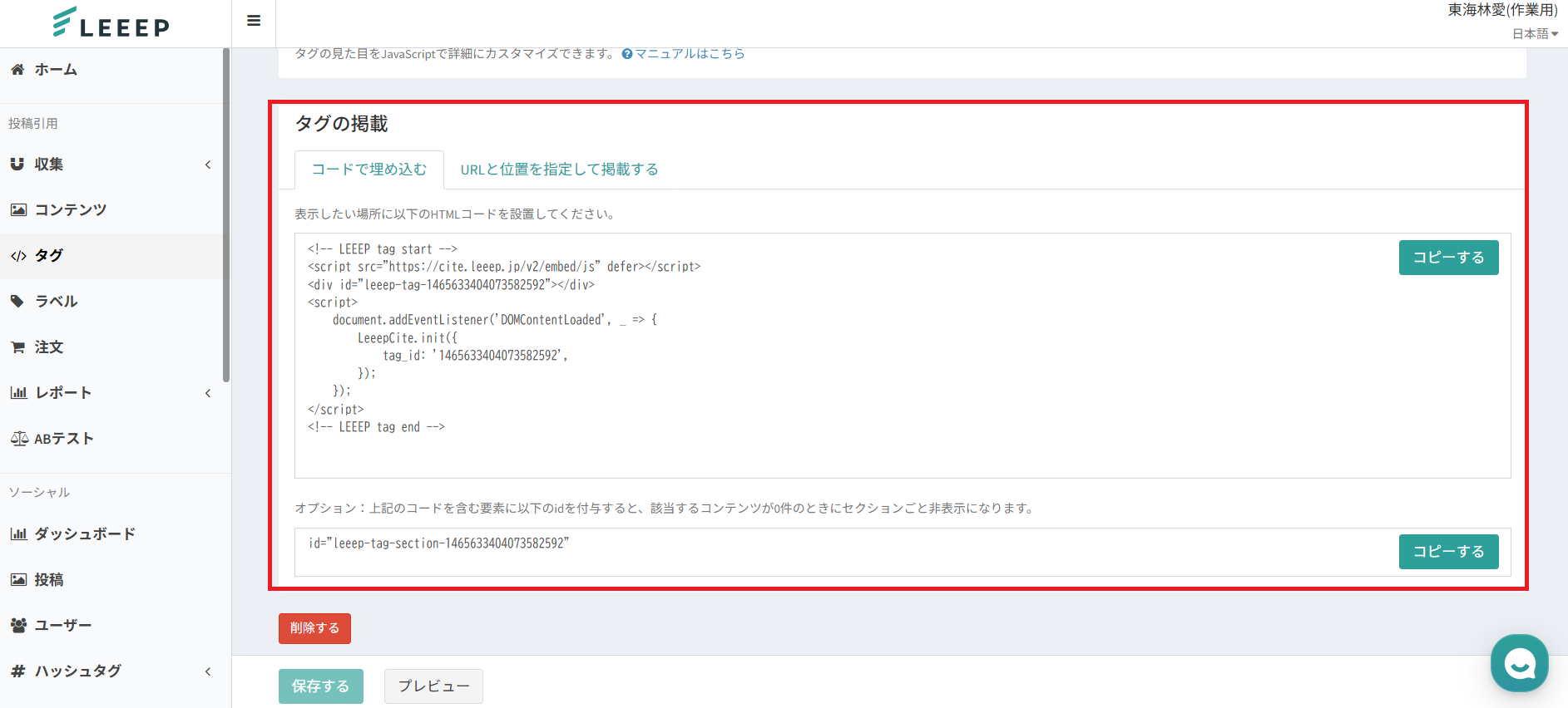 タグ編集画面で取得できるコードを、特集ページのコンテンツを表示させたい箇所に埋め込めば完了です。