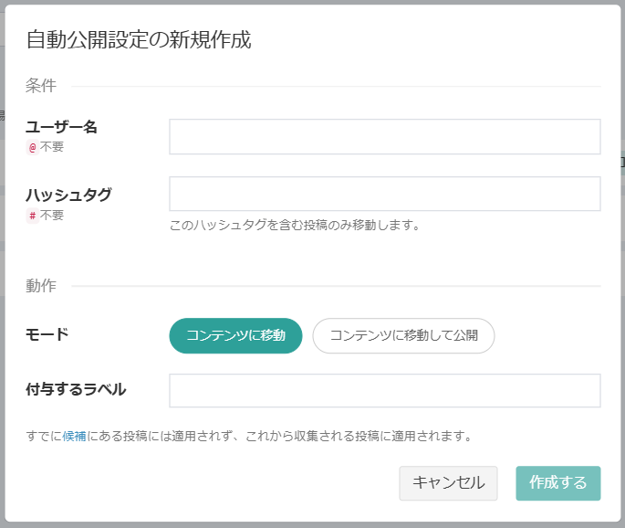 「作成する」を押下すれば設定完了です。これ以降に収集される投稿が自動公開設定の対象となります。