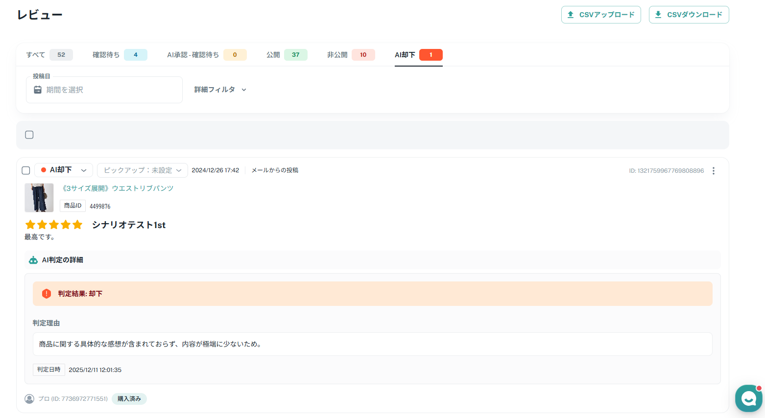 AI自動承認機能は、顧客からのレビューをAIが判定し、条件に応じて自動で公開・却下する機能です。