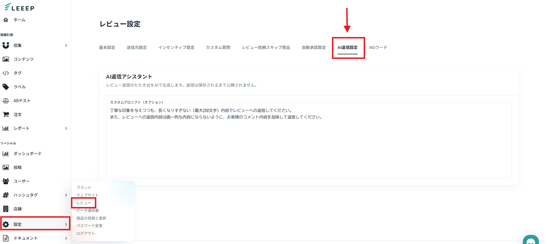 LEEEP管理画面の 設定 > レビュー >「AI返信設定」タブ から設定いただけます。