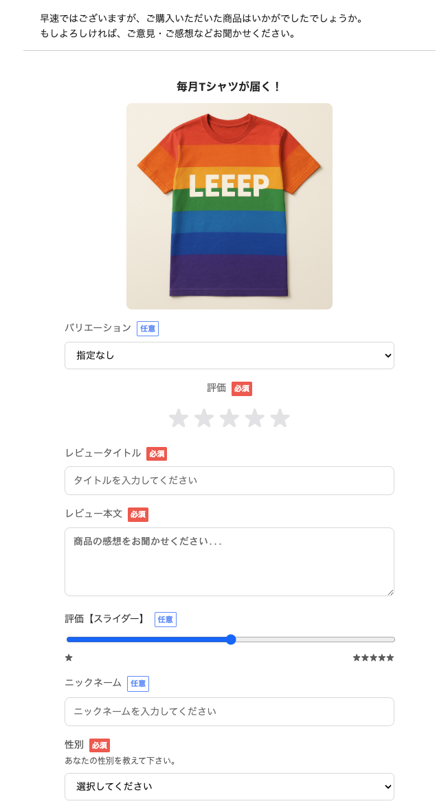 レビューフォームに設定されているカスタム質問もメール内で表示・回答が可能です。